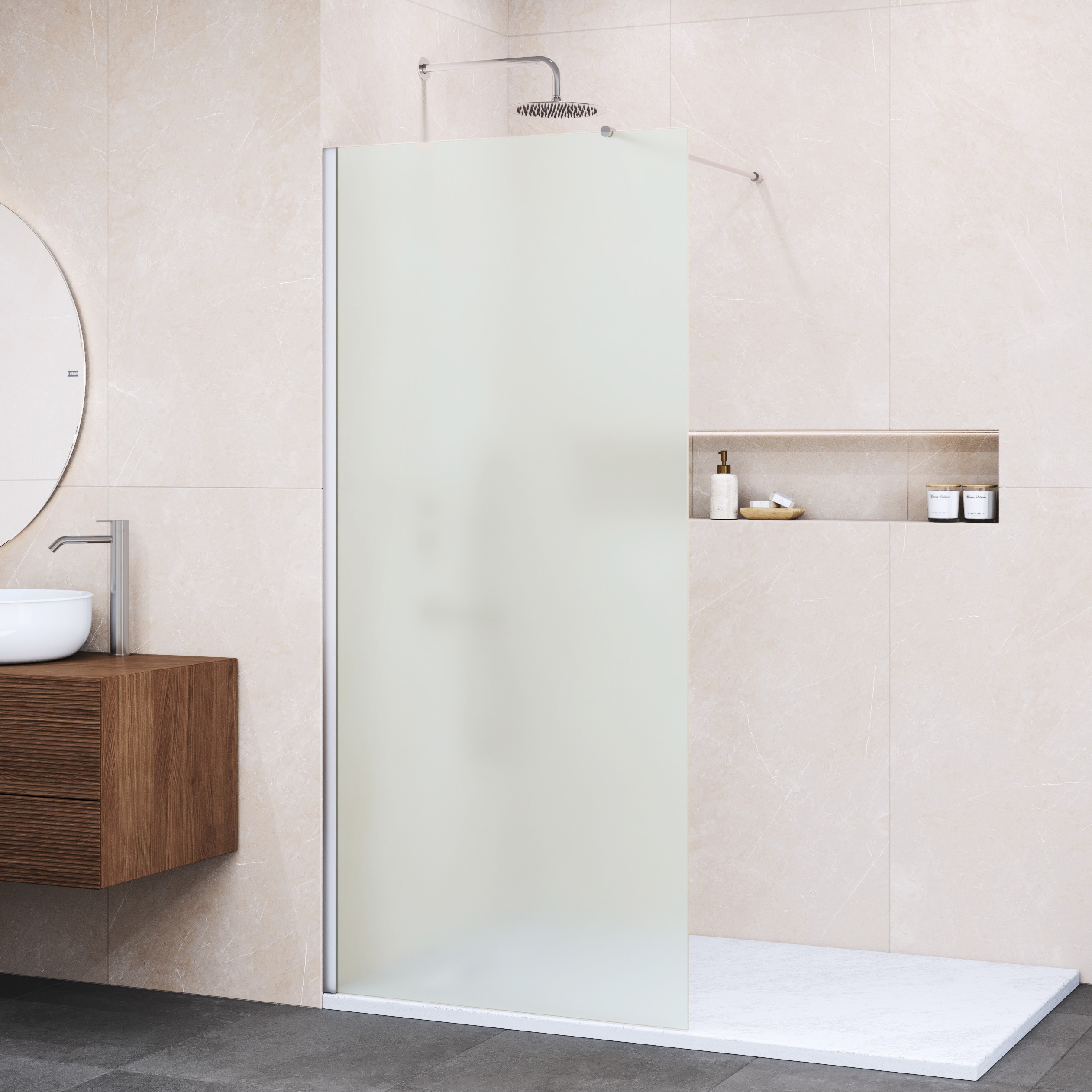Также перегородку можно укомплектовать матовым стеклом, что создаст эффект интимной зоны или тонированным стеклом, такое дополнение сделает интерьер ванной комнаты более строгим и изысканным.