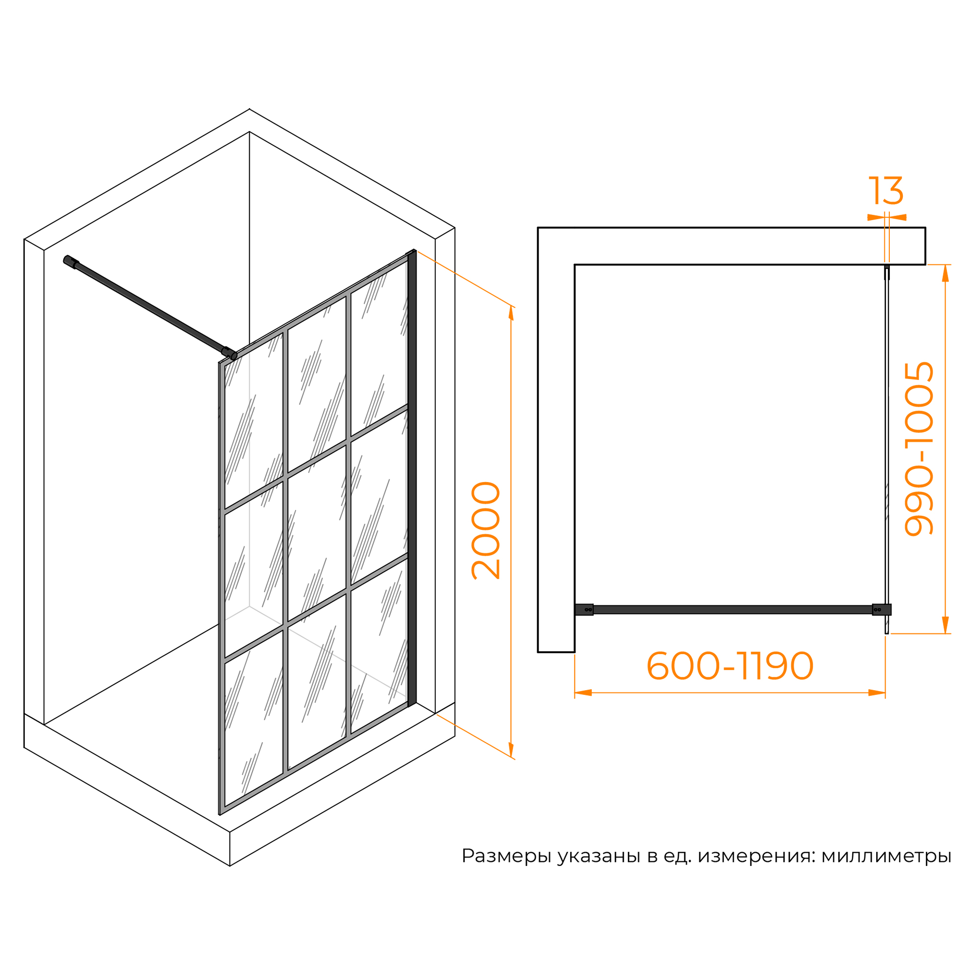 Душевая перегородка RGW Walk In WA-011B 100x200 черный/прозрачное принт 35101100-84