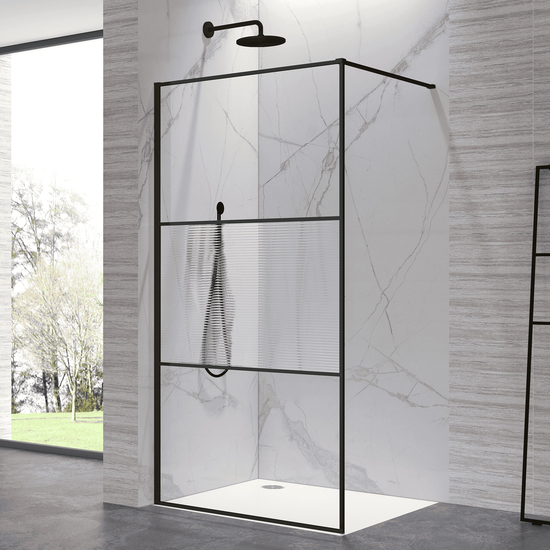 Высокопрочное премиальное закалённое стекло толщиной 8 мм, усиленный пристенный профиль ALUSTRONG MAX с антикоррозийной защитой и обрамление профилем по периметру каждого стекольного полотна (состоит из 3-х стекольных полотен) обеспечивают высокую надёжность и привлекательный внешний вид.