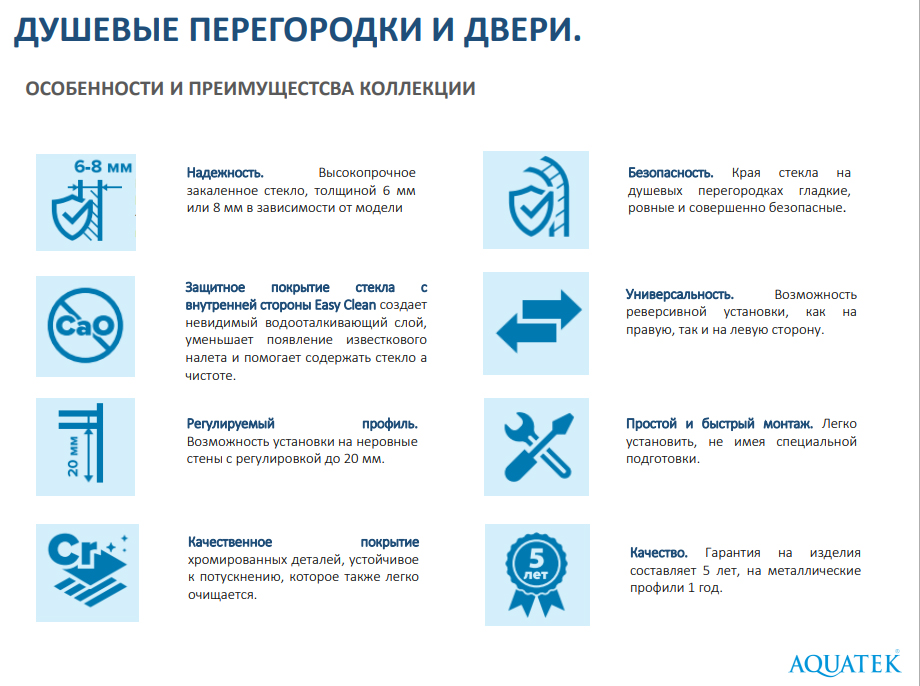 Надежность. В душевых перегородках Aquatek используется высокопрочное закаленное стекло, толщиной 6 мм или 8 мм в зависимости от модели