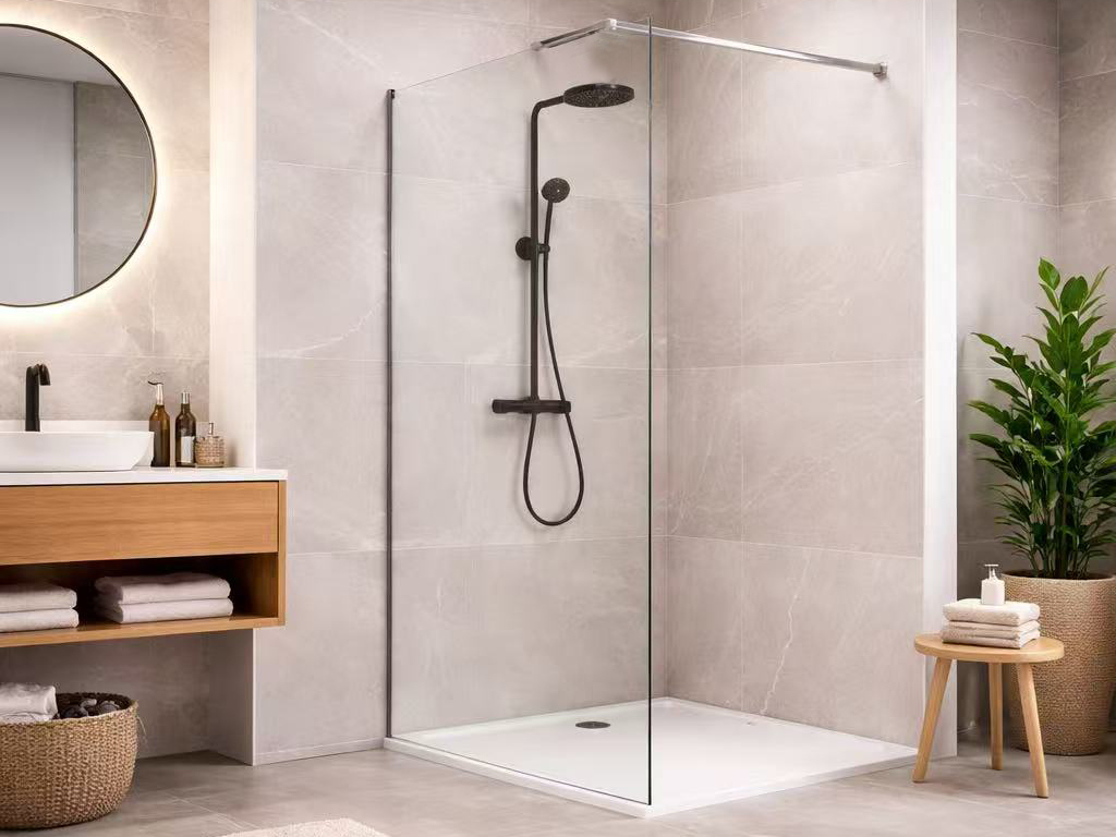 - Эффект бесконечного пространства: Отсутствие порога и массивных рам визуально объединяет душевую зону с остальным помещением, что идеально для небольших и совмещенных санузлов.
