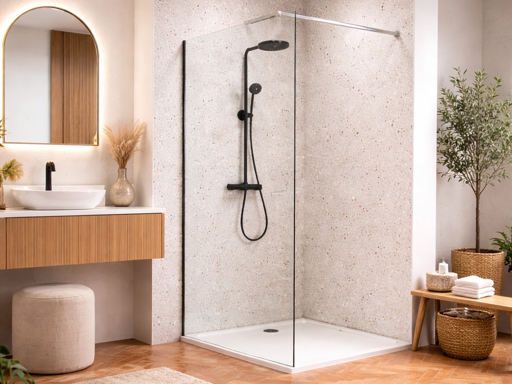 - Эффект бесконечного пространства: Отсутствие порога и массивных рам визуально объединяет душевую зону с остальным помещением, что идеально для небольших и совмещенных санузлов.