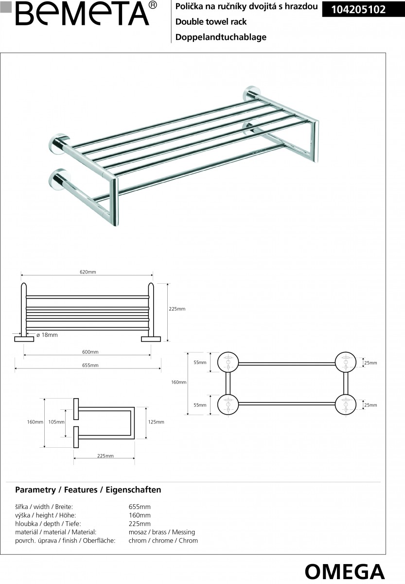 - Полка для полотенец с вешалкой Bemeta Omega 104205102 (65,5 см)