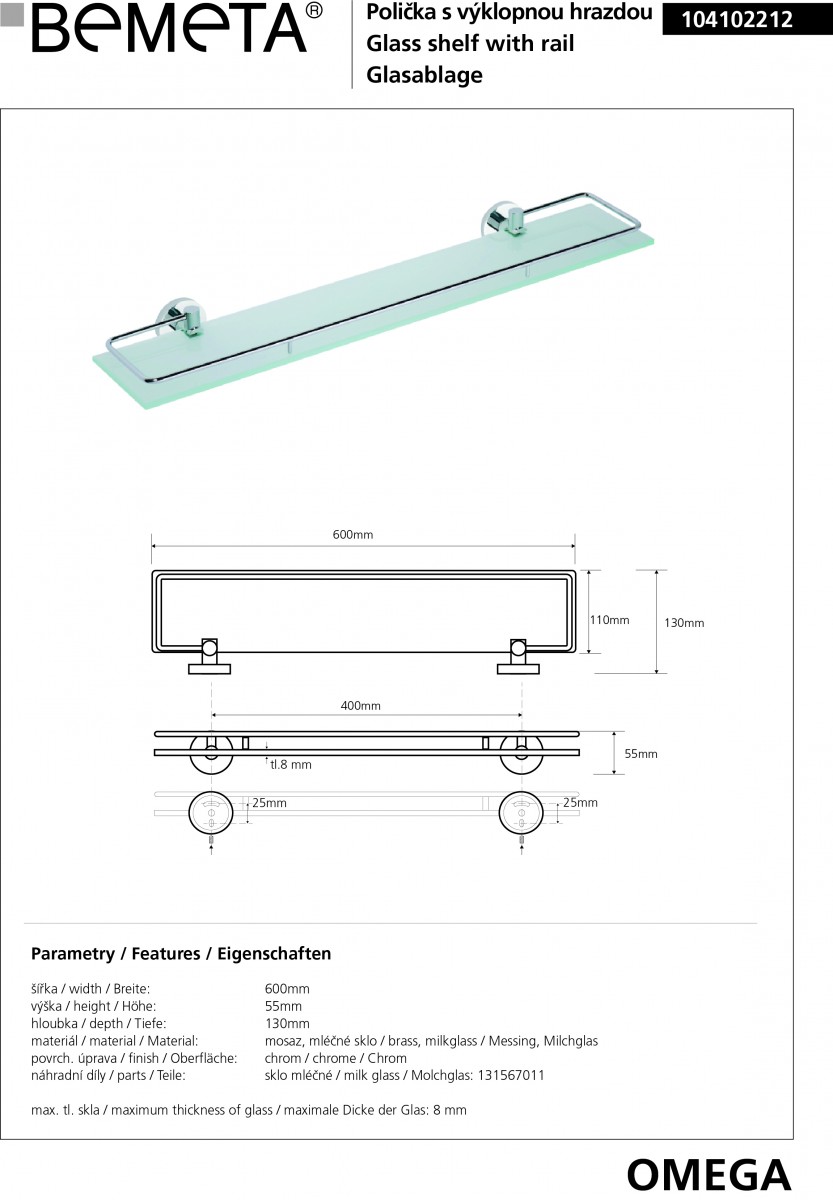 Полка стеклянная с ограничителем Bemeta Omega 104102212 (60 см)