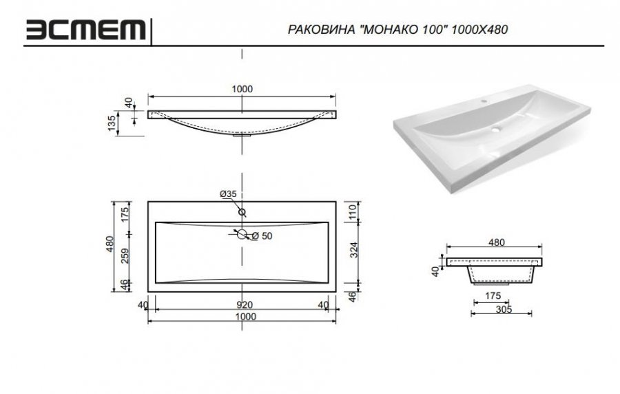 Раковина Эстет Монако 100х48 см (раковина+упаковка)