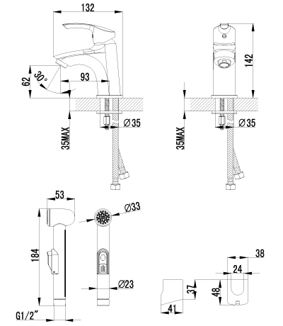 - Аксессуары в комплекте: лейка для биде с нажимным механизмом, шланг 1,5 м, настенное крепление для лейки