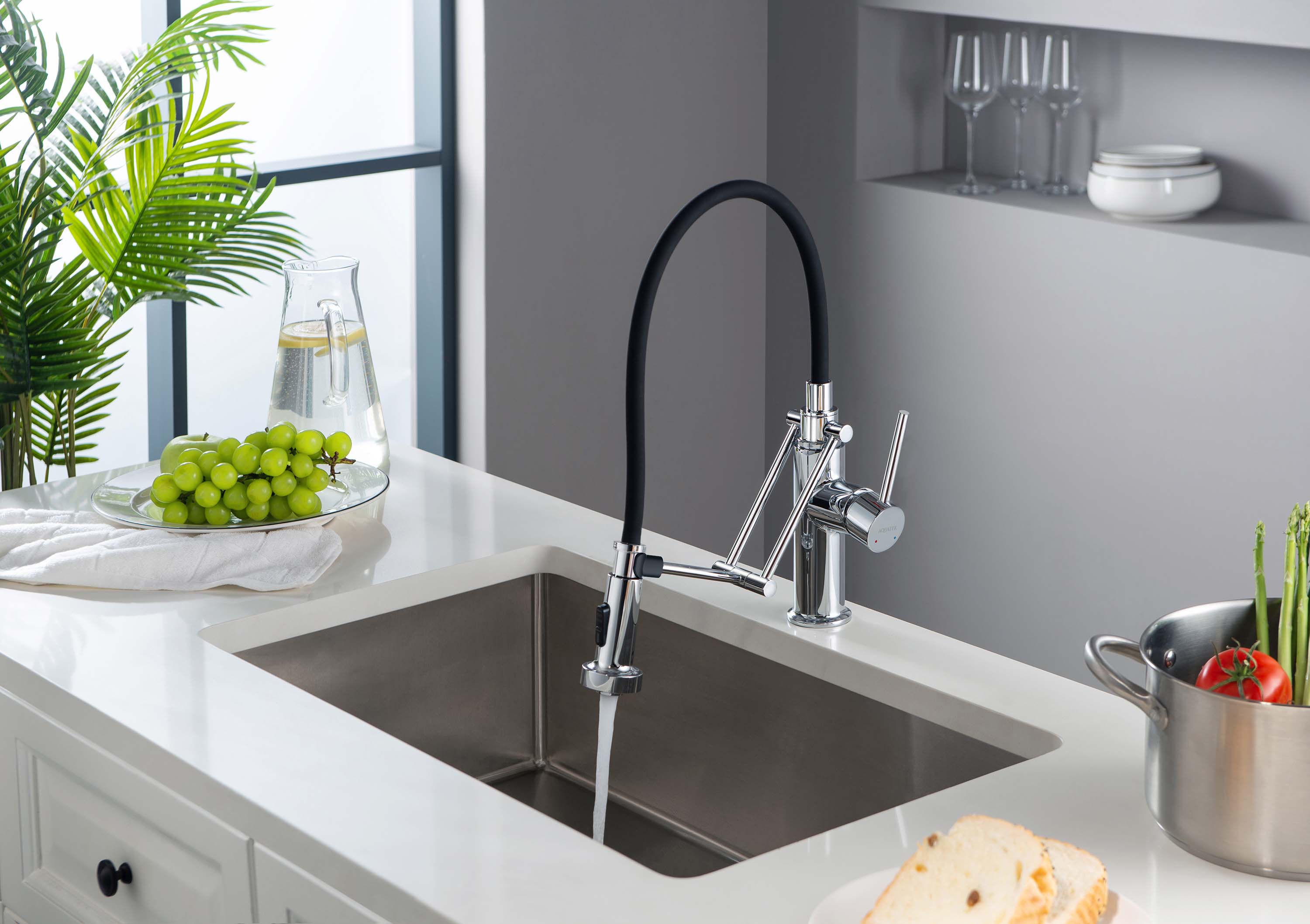• оснащен гибким поворотным вытяжным изливом из резины, с вращением 360°, удобен для мытья крупных предметов