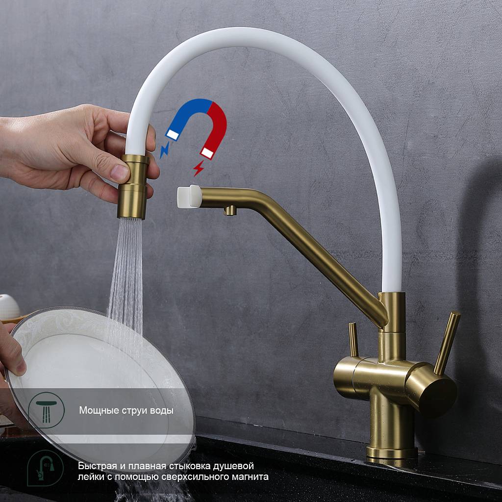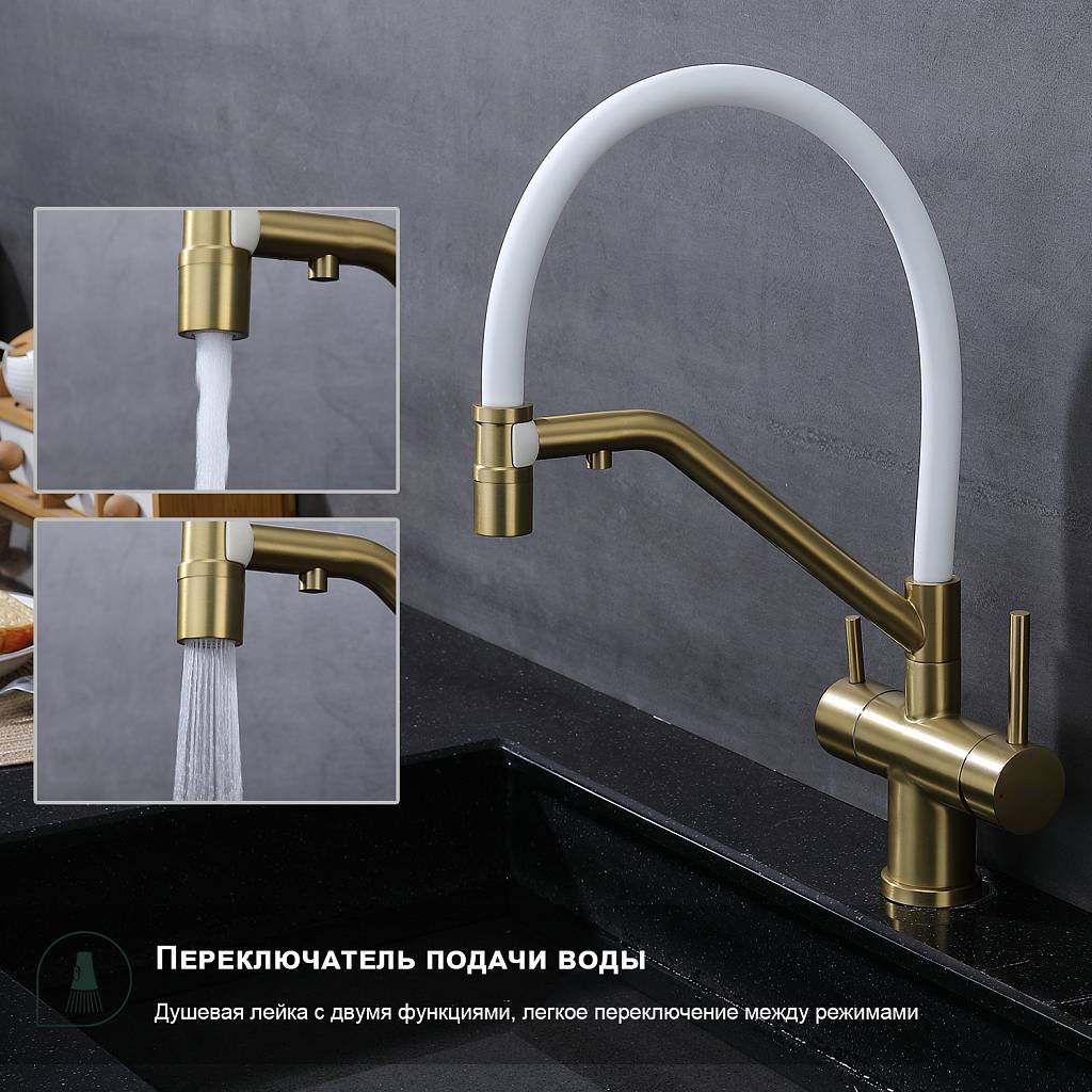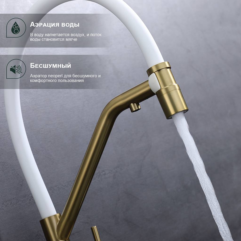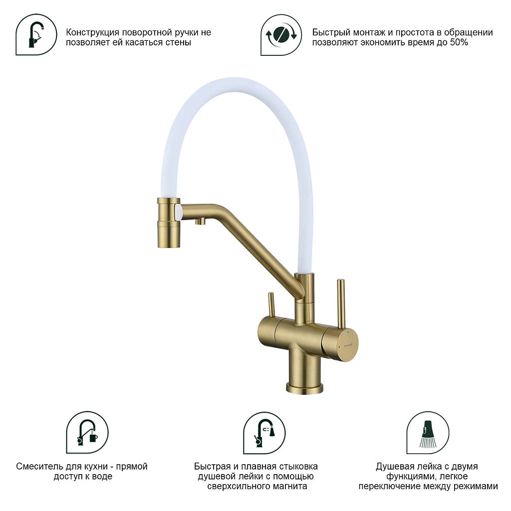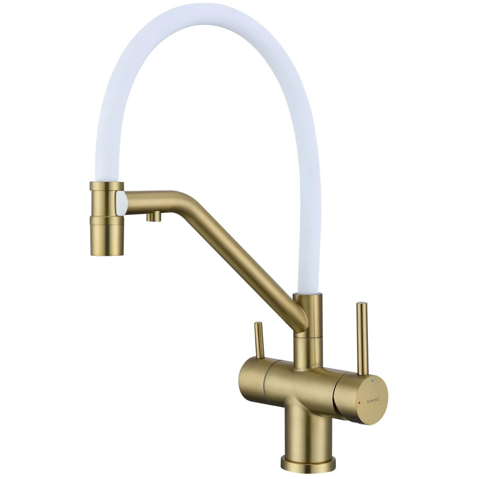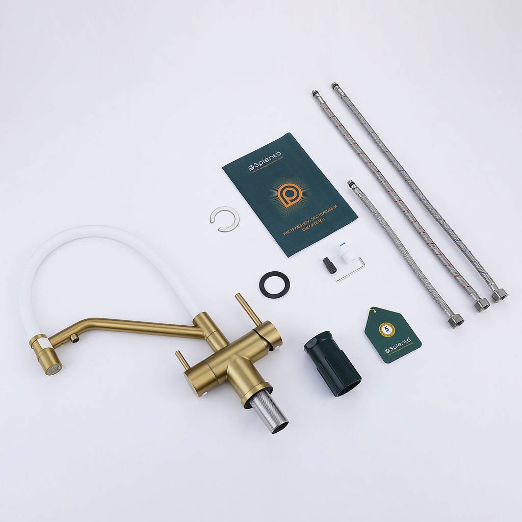 Смеситель для кухни под фильтр с гибким изливом Splenka S70.62.03 золотой сатин/белый