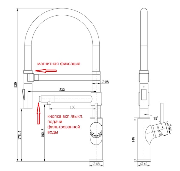 Излив для питьевой воды с кнопкой для вкл/выкл. фильтрованной воды
