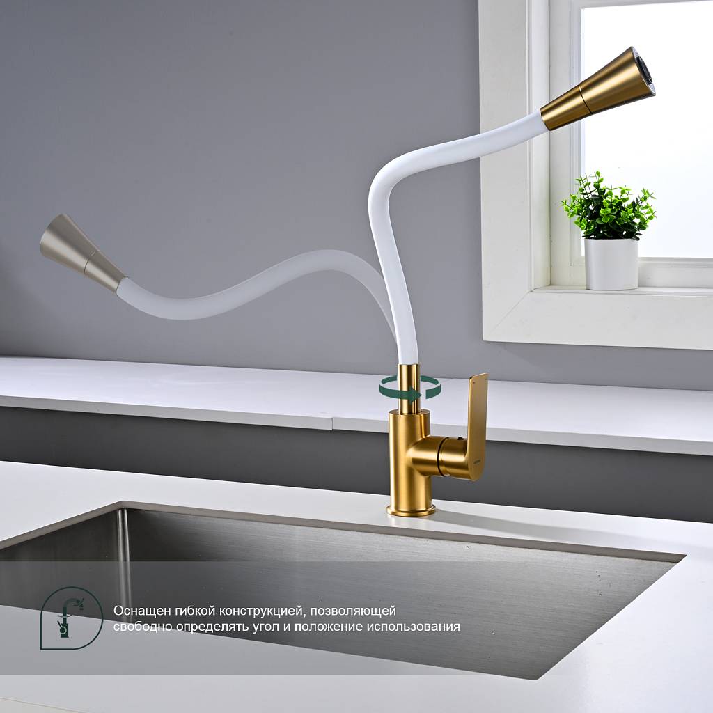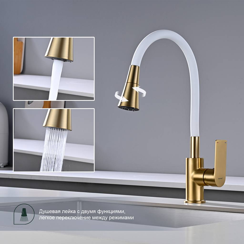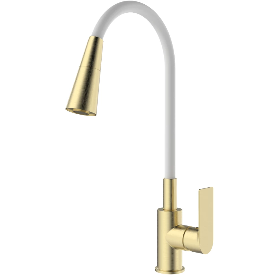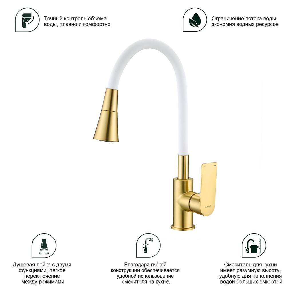 Смеситель для кухни с гибким изливом Splenka S05.43.03 золотой сатин/белый