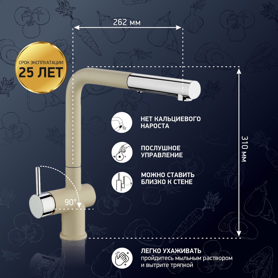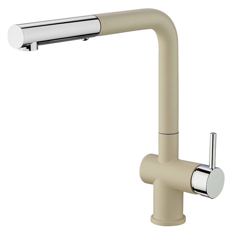 Три варианта бежевого цвета: сахара, бежевый с вкраплениями (гранит) и нежный трюфель, а также белый с вкраплениями (гранит) и комбинация черного и хромого цветов в корпусе смесителя. Теперь точно получится попасть в цвет столешницы и/или цвет мойки либо создать контрастные сочетания. Все варианты покрытия, включая покрытие под камень, выполнены по специальной технологии, сохраняющей цвет и фактуру надолго и облегчающей уход за смесителем.