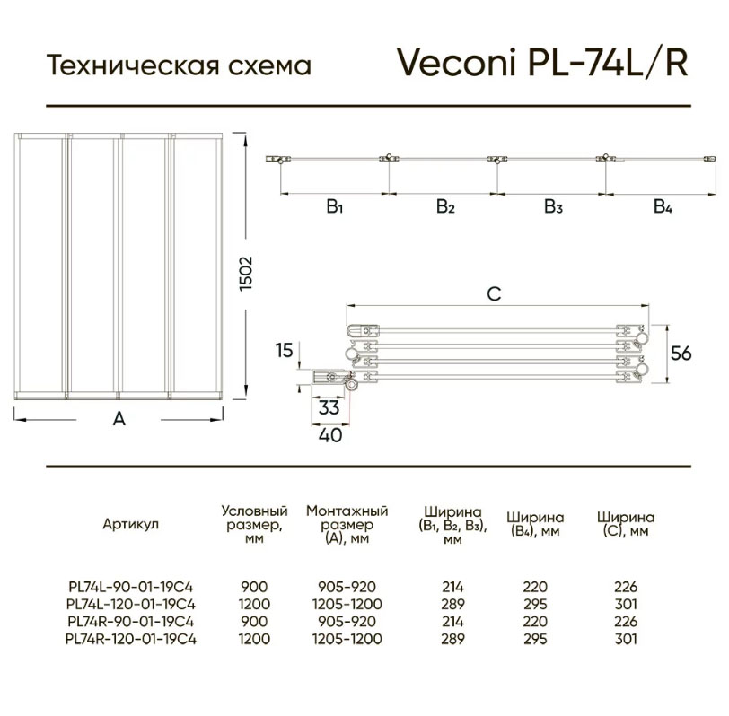 Шторка на ванну складная Veconi Palau PL-74 120х150 см хром/ прозрачное PL74L-120-01-19C4/PL74R-120-01-19C4