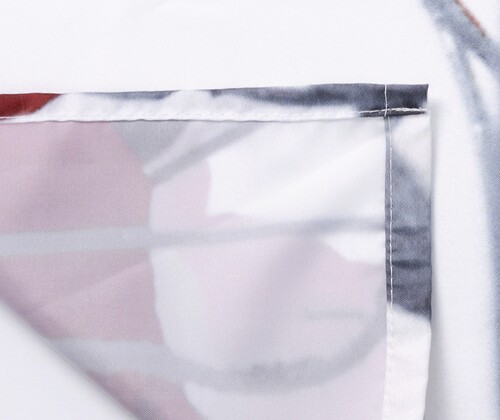 Верх шторки завершают люверсы белого цвета, которые крепко сцеплены с самим изделием. Они препятствуют разрыву ткани в местах максимального натяжения.
