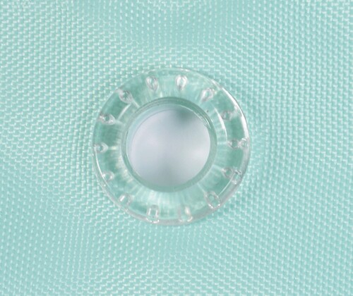 Верх шторки завершают люверсы белого цвета, которые крепко сцеплены с самим изделием. Они препятствуют разрыву ткани в местах максимального натяжения.