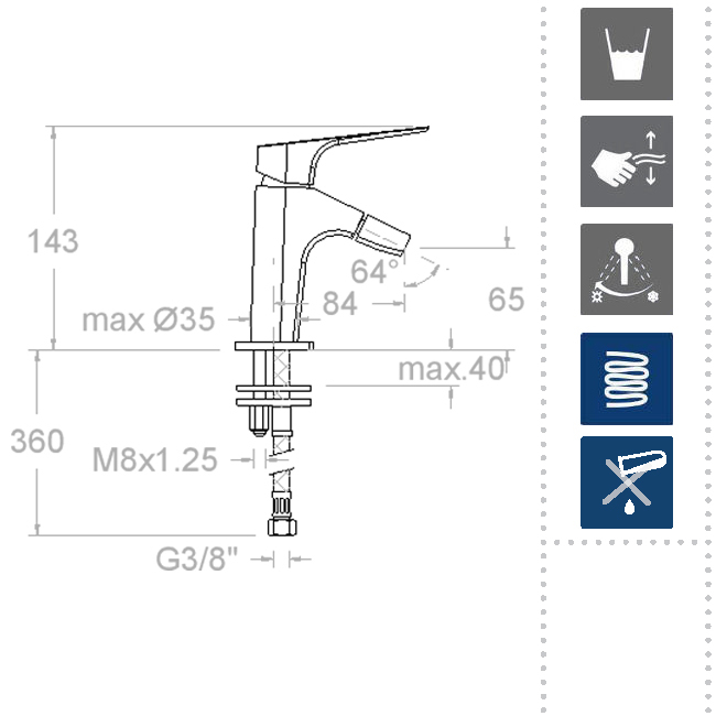 * Термостатический картридж с системой горячего блока для защиты от ожогов и системой термостата для блокировки температуры при 38°.