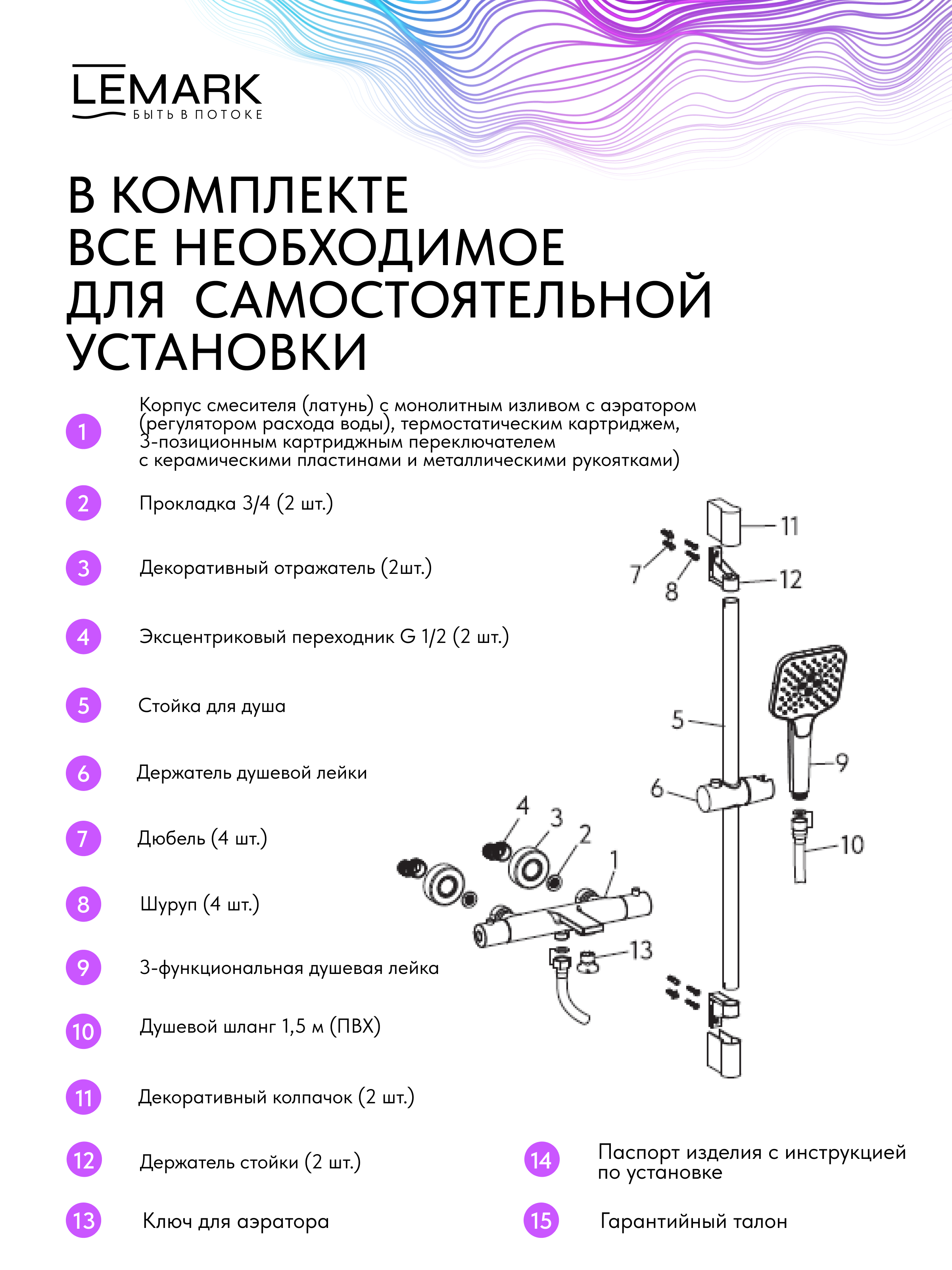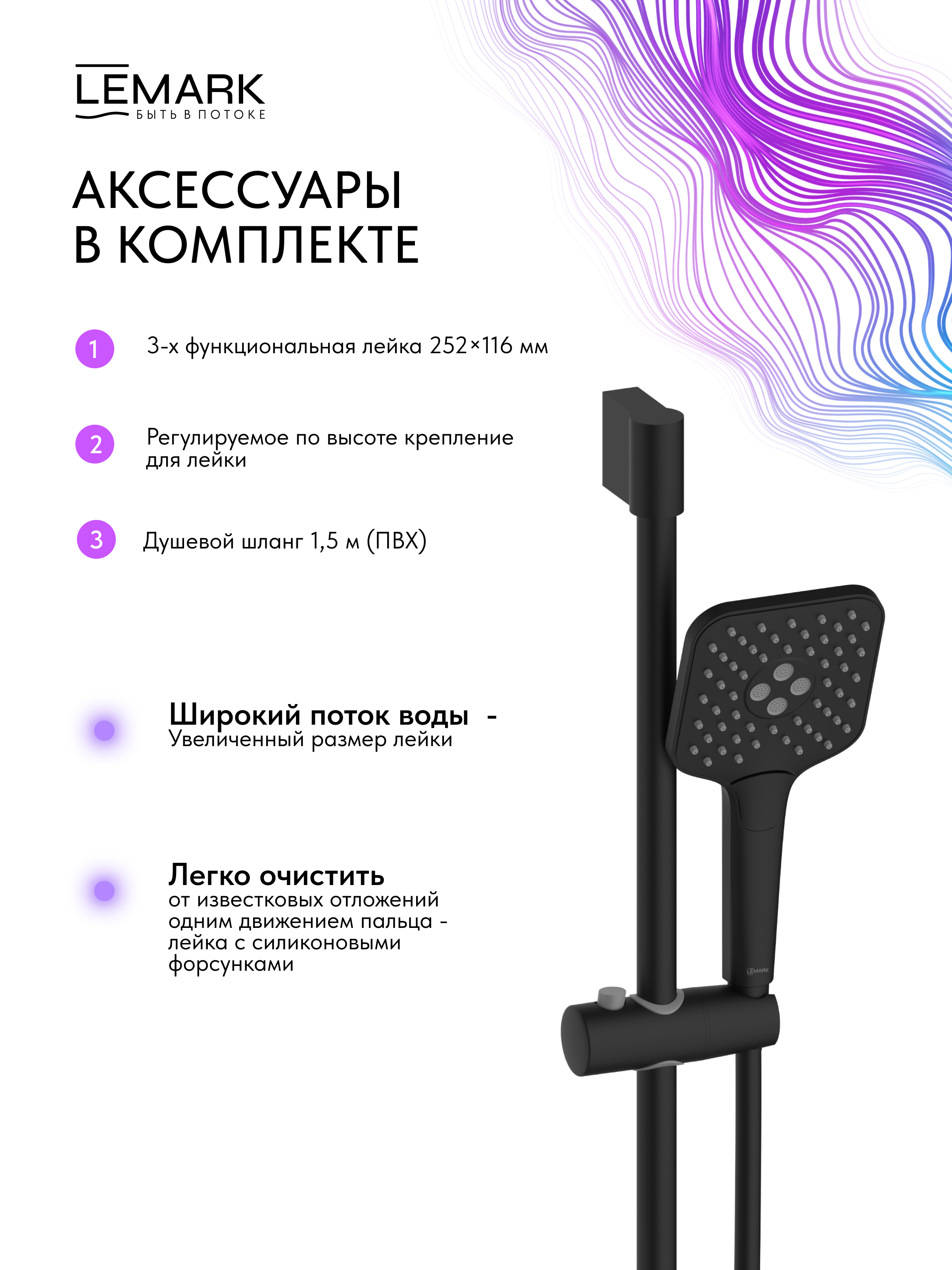 | Особенности | Лейка 3 режима АБС-пластик, держатель лейки регулируемый по высоте, ПВХ шланг 1,5 м |