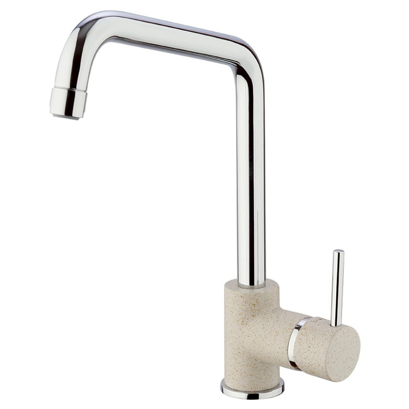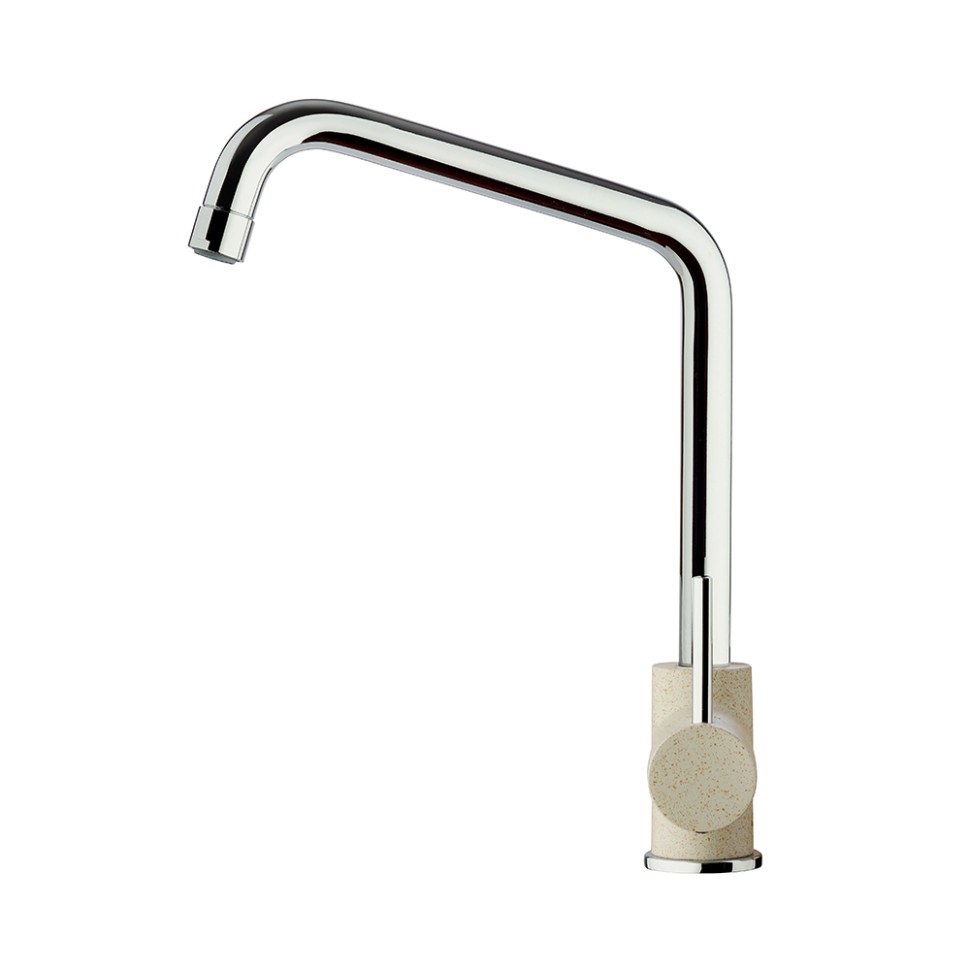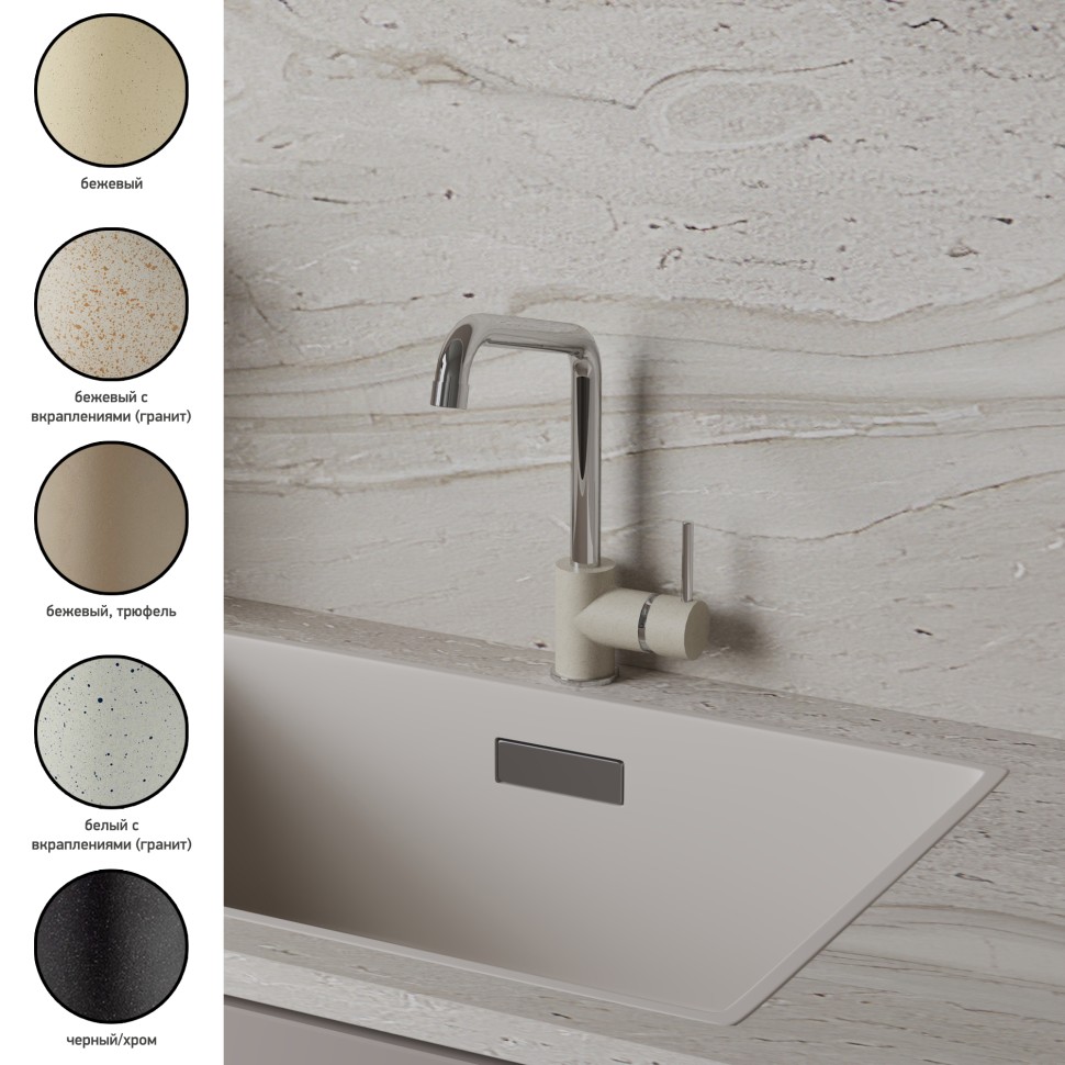 Белый с вкраплениями (гранит), комбинация черного и хромого цветов в корпусе смесителя, и три варианта бежевого цвета: сахара, бежевый с вкраплениями (гранит) и нежный трюфель. Теперь точно получится попасть в цвет столешницы и/или цвет мойки либо создать контрастные сочетания. Все варианты покрытия, включая покрытие под камень, выполнены по специальной технологии, сохраняющей цвет и фактуру надолго и облегчающей уход за смесителем.