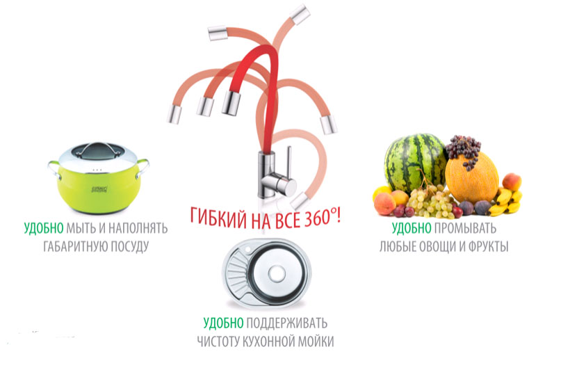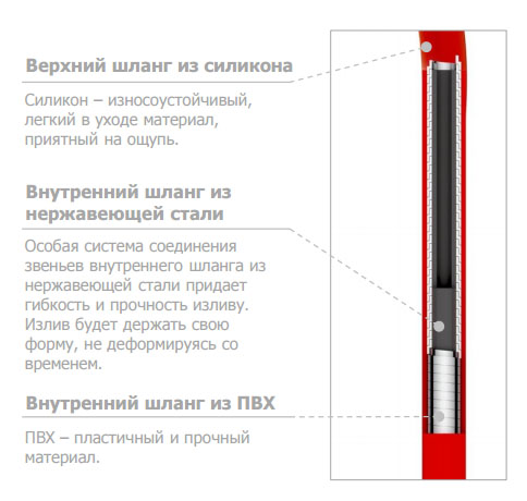 Особенности: гибкий силиконовый излив на все 360⁰, внутренний шланг из нержавеющей стали - особая система соединения звеньев внутреннего шланга из нержавеющей стали придает гибкость и прочность изливу. Излив будет держать свою форму, не деформируясь со временем.