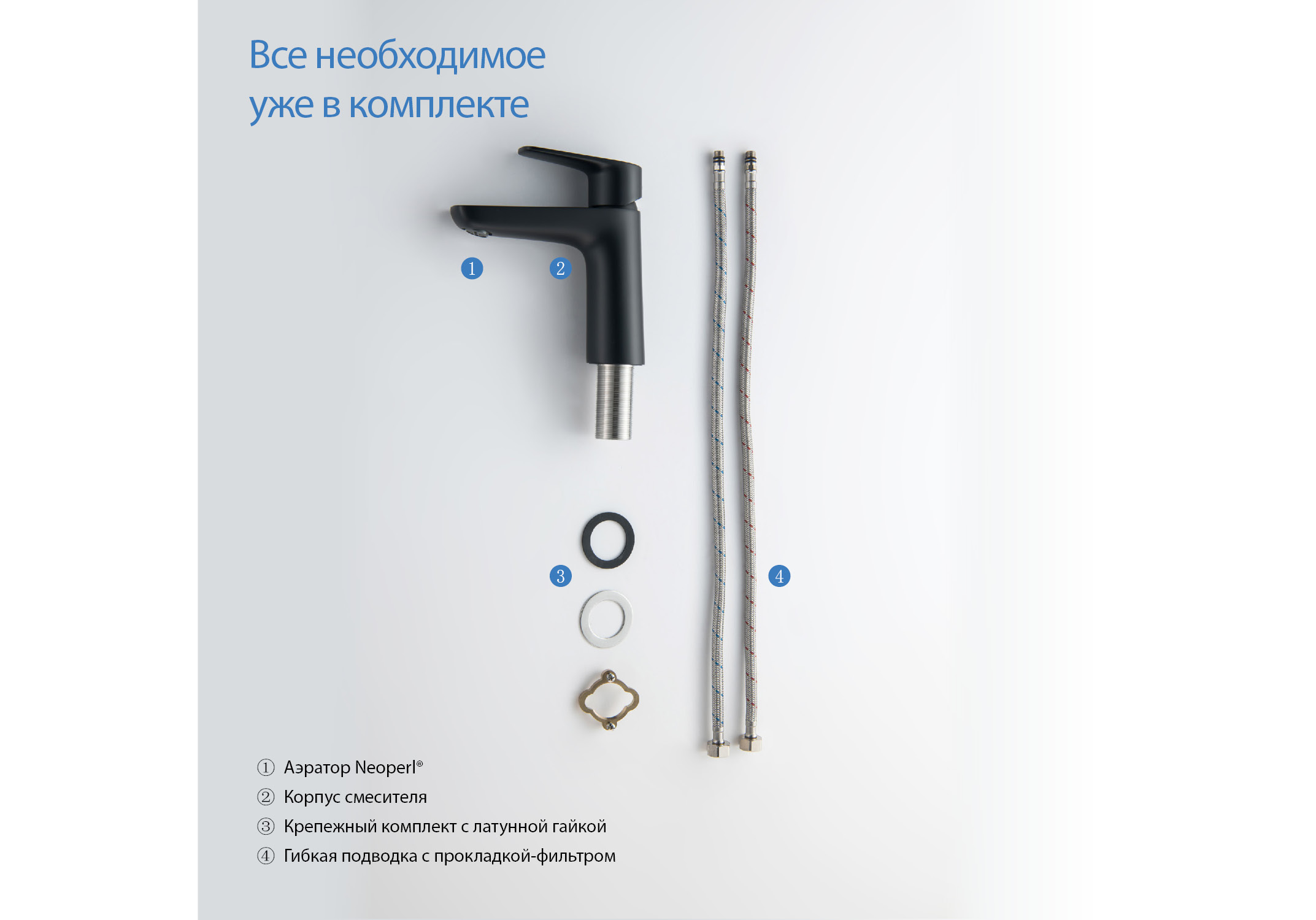 В комплект входят все необходимые крепления и подводка 60 см в металлической оплетке, что делает установку максимально простой и удобной. Подводка дополнительно оснащена прокладкой с сетчатым фильтром.