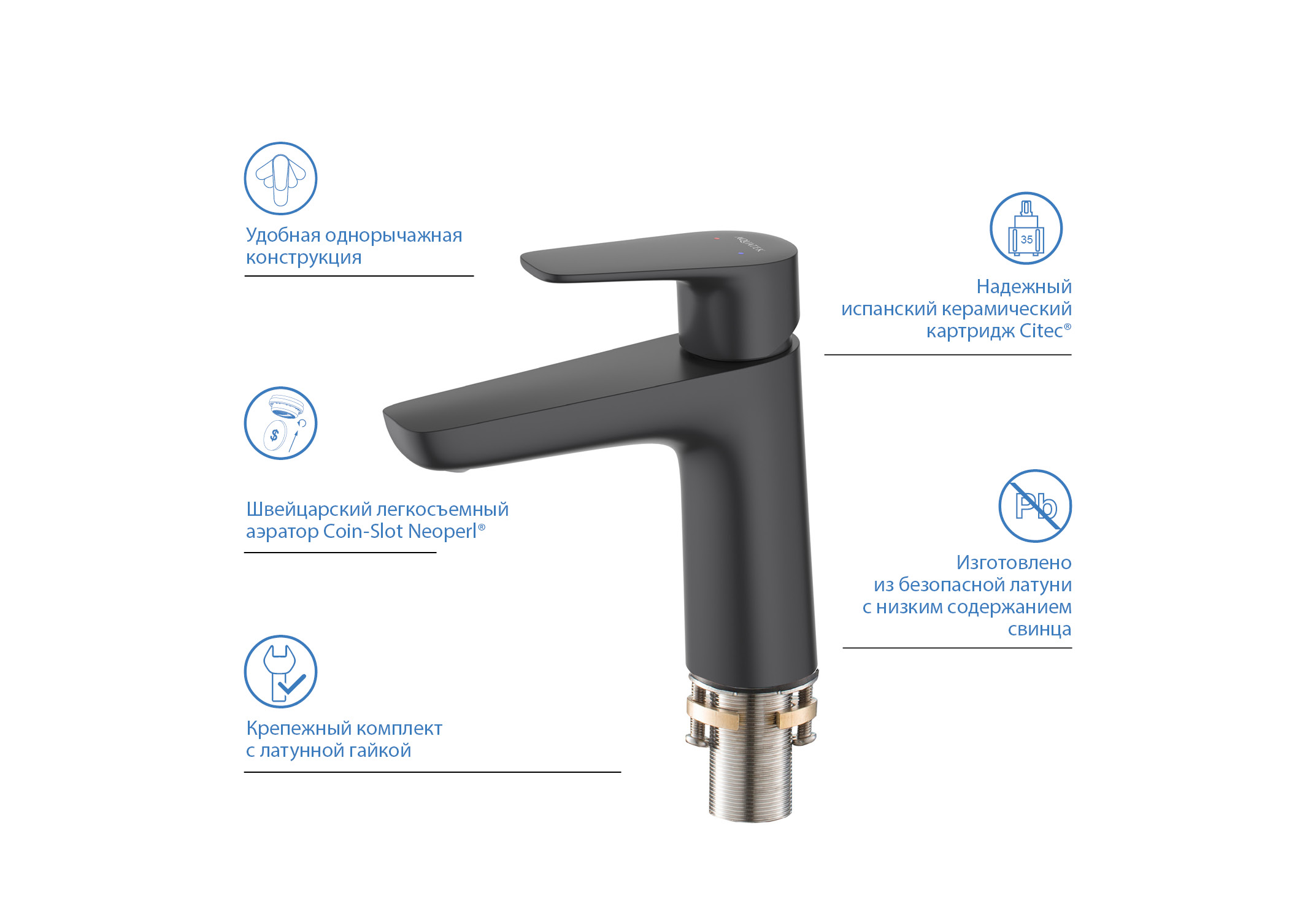 Смеситель оснащен испанским керамическим картриджем Citec, рассчитанным на 500 тыс. циклов использования и обеспечивающим плавную регулировку температуры и напора воды.