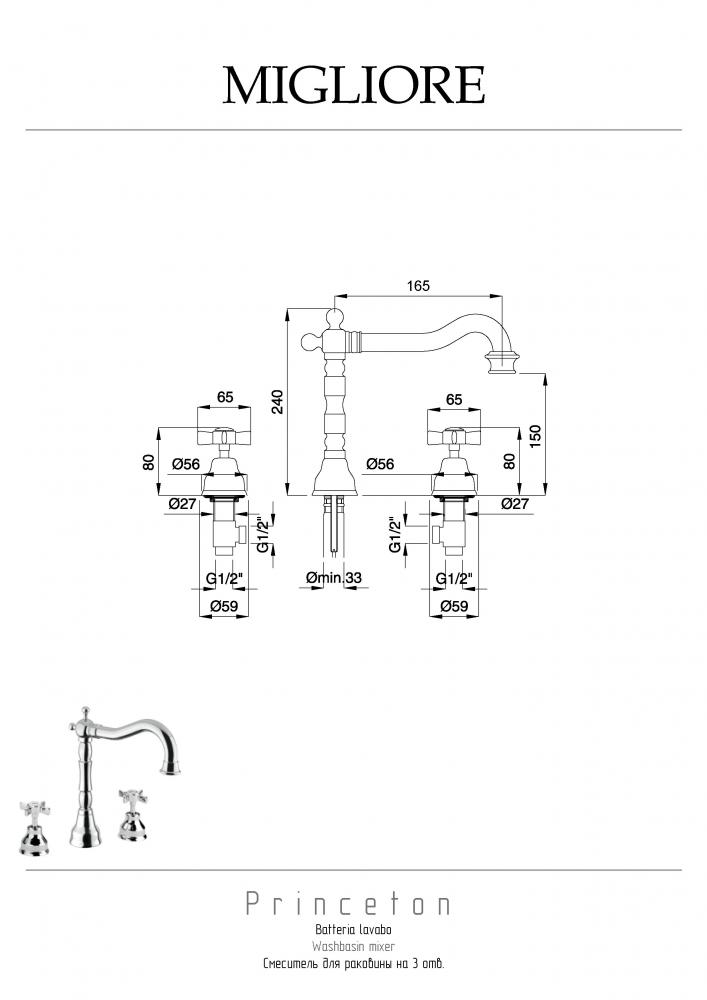 Смеситель для раковины на 3 отв. Migliore Princeton 19389 медь