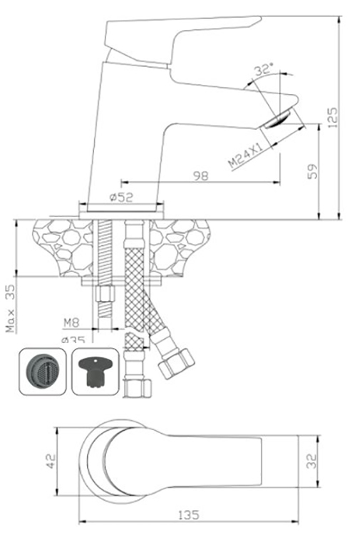 - Смеситель комплектуется скрытым аэратором OLIVE’S. Аэратор имеет специальный слот под монету, который позволяет осуществлять