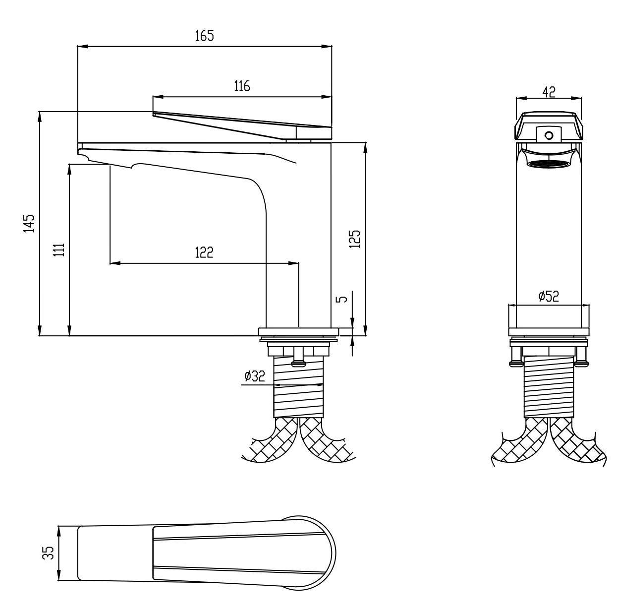 Высота смесителя составляет 14,5 см, длина излива — 16,5 см, диаметр основания — 5 см. Данные размеры оптимальны для большинства стандартных раковин. Подключение осуществляется к стандартным водопроводным коммуникациям с помощью гибких шлангов, которые также входят в комплект. Смеситель отвечает всем современным требованиям по экономии воды и имеет высокие показатели функциональности и качества. Его максимально простая форма и стильный внешний вид прекрасно впишутся в любой интерьер, от классики до хай-тека.