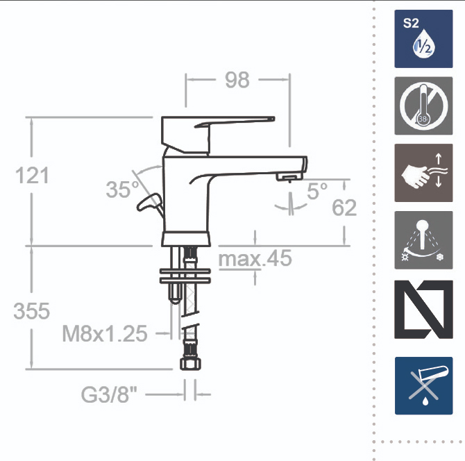 * Водосберегающая система S2 (C2 доступна на некоторых моделях), открывая ручку смесителя в два этапа.