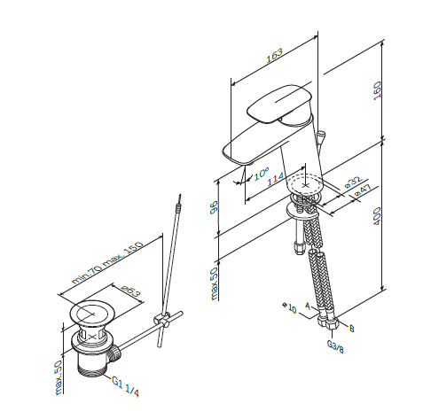Излив: 114 мм, установка на одно отверстие, рычажный донный клапан 1 1/4“ с переливом, AM.PM Soft Motion 35 мм керамический картридж, Rub&Clean аэратор, гибкая подводка G 3/8“