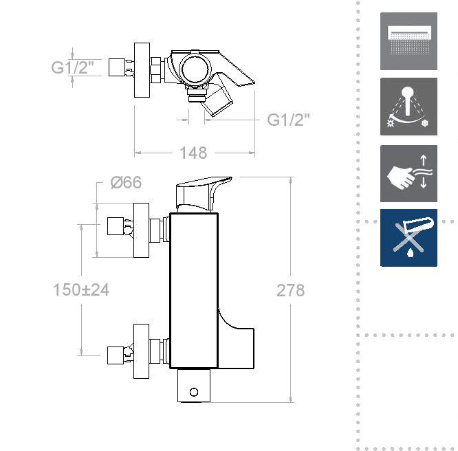 * Термостатический картридж с системой горячего блока для защиты от ожогов и системой термостата для блокировки температуры при 38°.