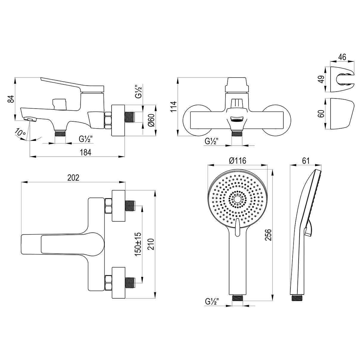 | В комплекте | Лейка Ø116×256 мм 3 режима, настенное крепление для лейки, шланг 1,5 м, крепеж |
