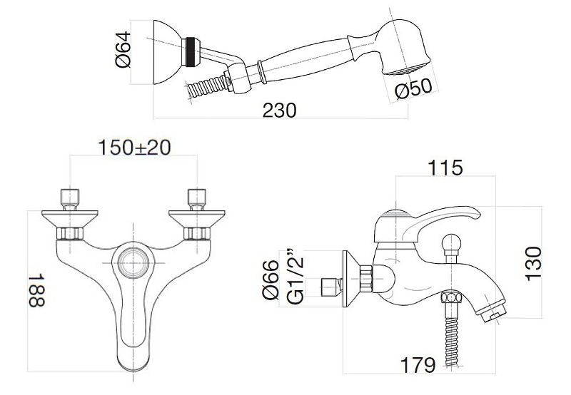 Комплектация: смеситель, лейка, держатель лейки, шланг