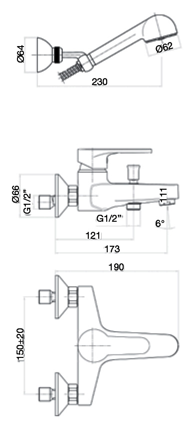 Комплектация: смеситель, лейка, держатель лейки, шланг