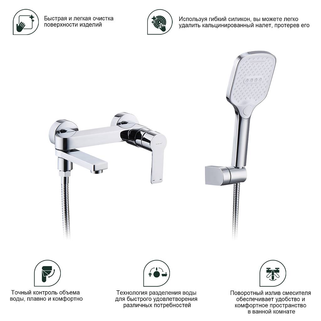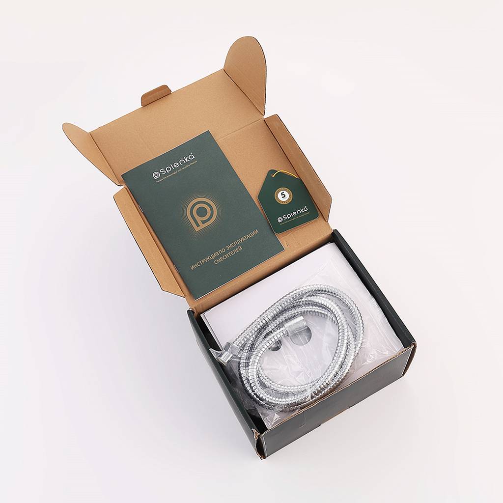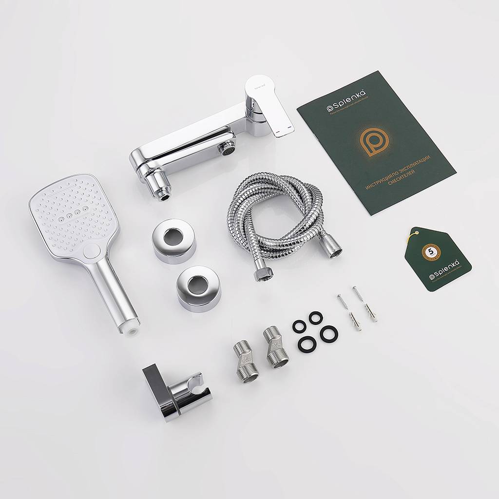 | Особенности | Смеситель, шланг, душевая лейка, держатель душевой лейки, эксцентрики, отражатели |
