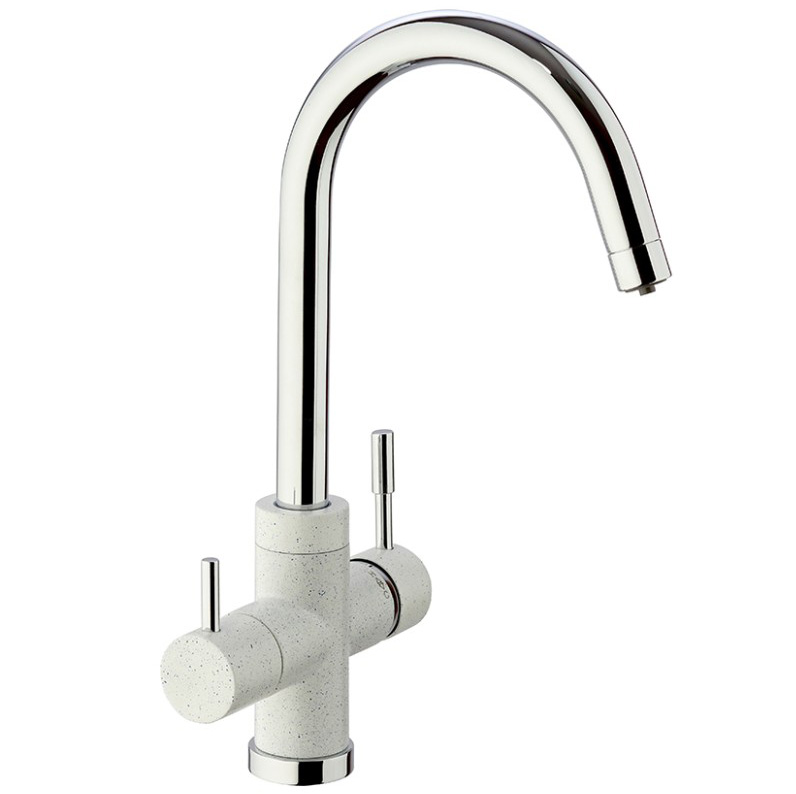 Три варианта бежевого цвета: сахара, бежевый с вкраплениями (гранит) и нежный трюфель, а также белый с вкраплениями (гранит) и комбинация черного и хромого цветов в корпусе смесителя. Теперь точно получится попасть в цвет столешницы и/или цвет мойки либо создать контрастные сочетания. Все варианты покрытия, включая покрытие под камень, выполнены по специальной технологии, сохраняющей цвет и фактуру надолго и облегчающей уход за смесителем.