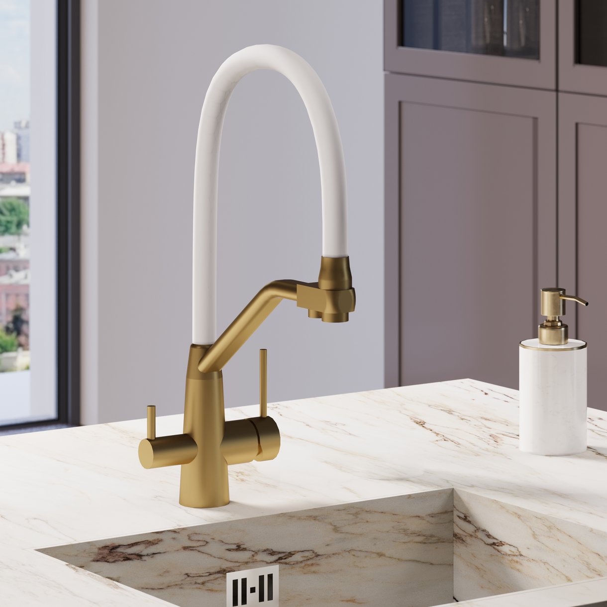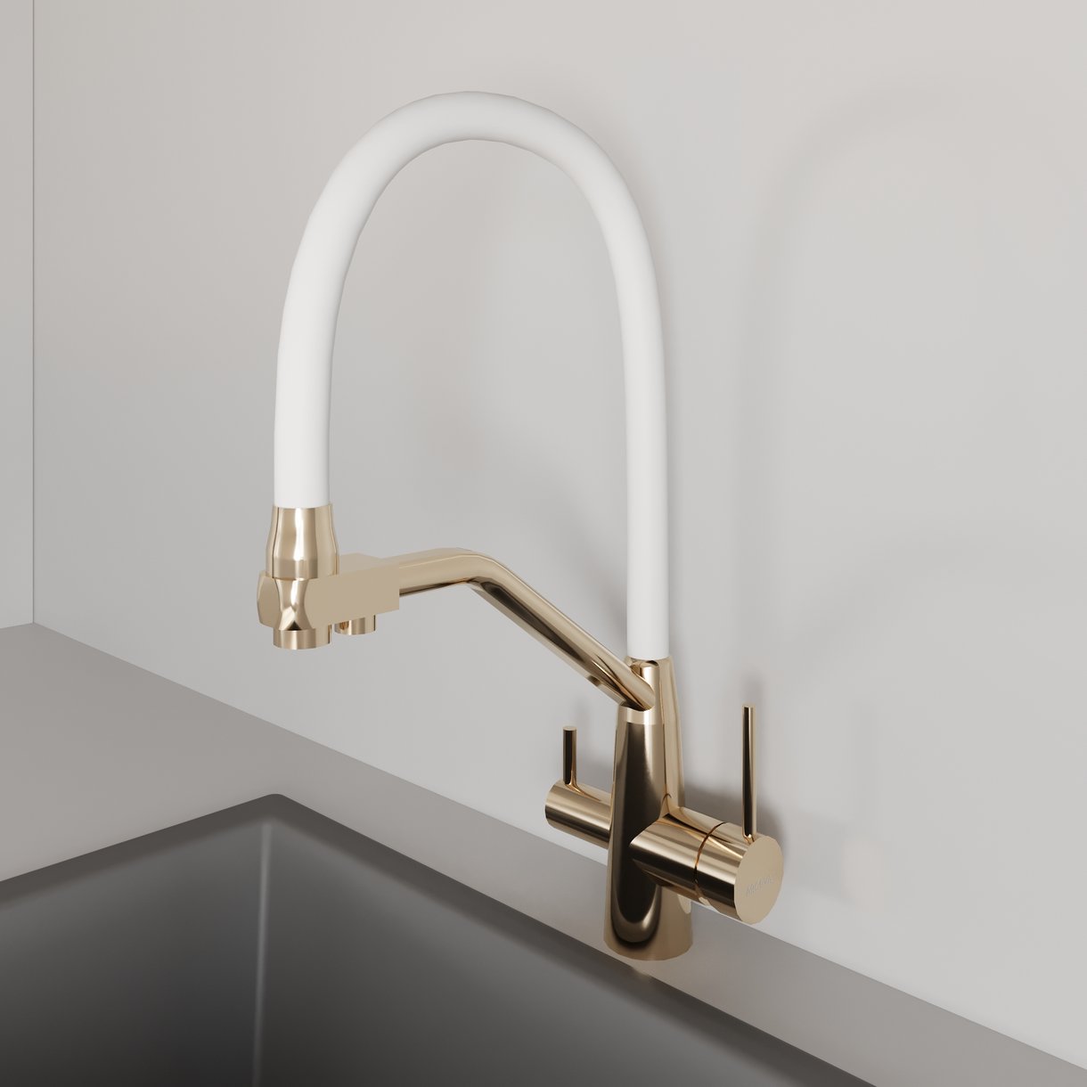 Смеситель для кухни под фильтр с гибким изливом Avrora Kitchen золото/ белый AV9006Gold