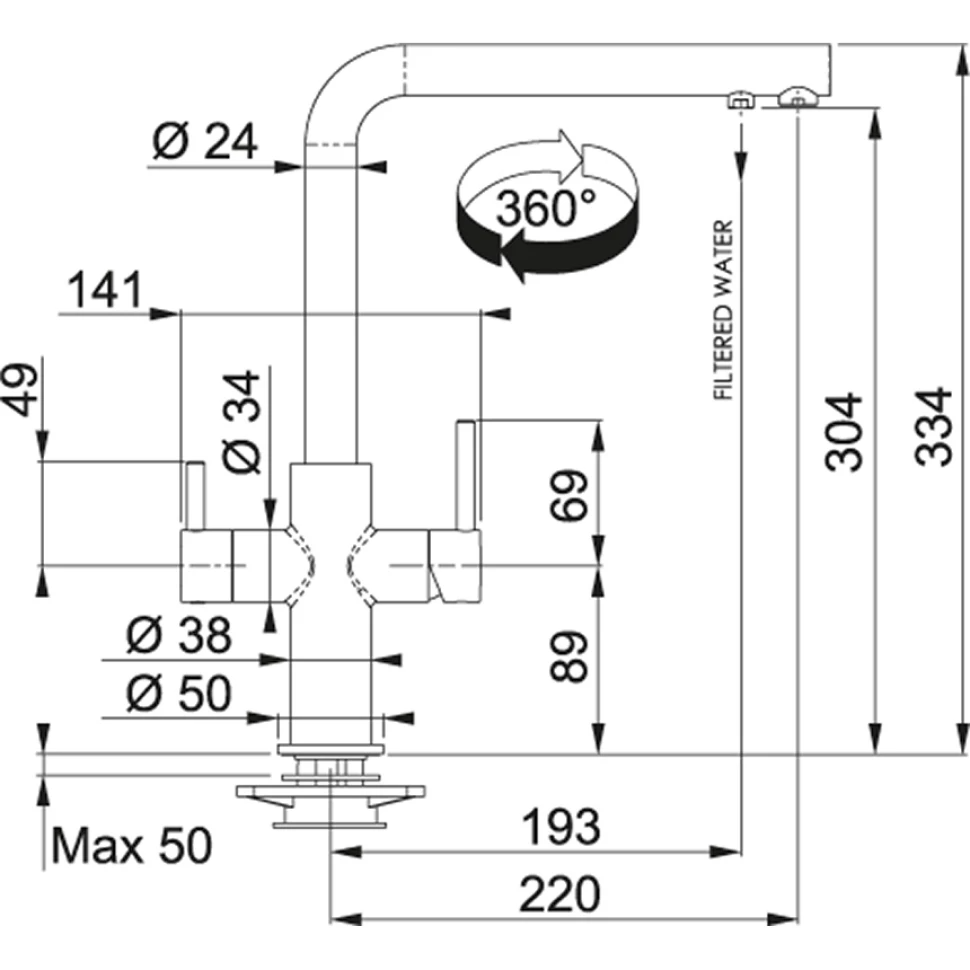 - Угол поворота излива 360∘