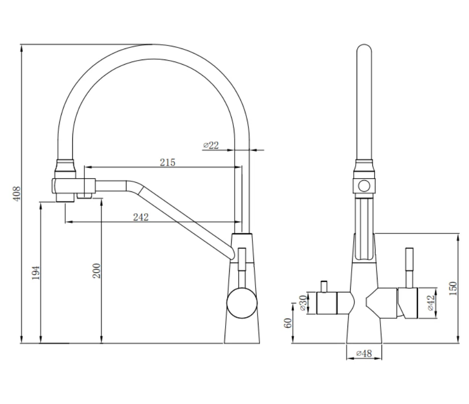 Смеситель оборудован двумя дополнительными кранами, обеспечивая доступ к фильтрованной воде и горячей/холодной воде из основного водопровода. Благодаря продуманной конструкции переключение между режимами осуществляется одним движением руки, обеспечивая удобство и простоту использования. Керамический картридж смесителя обеспечивает плавное и точное регулирование потока и температуры воды.