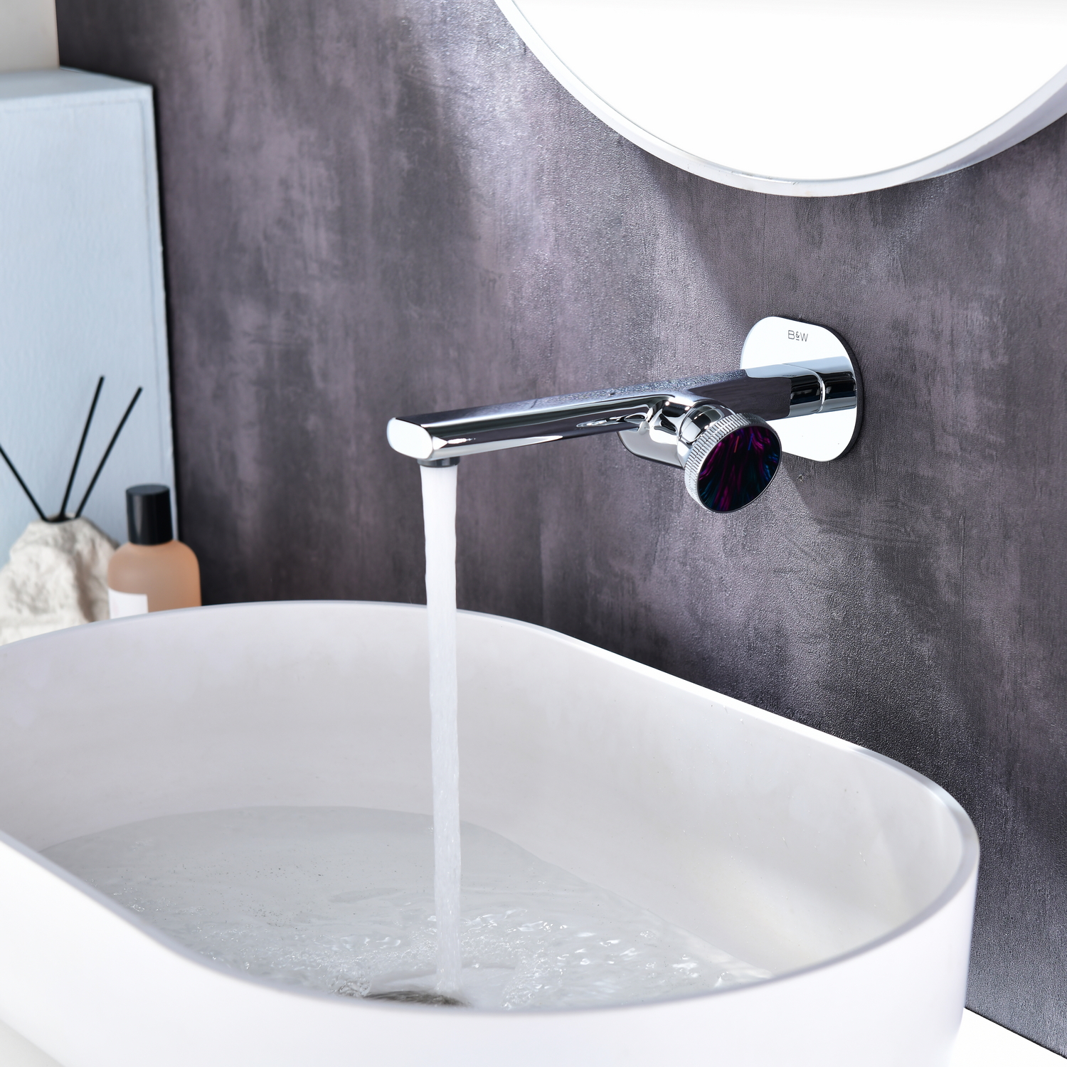 Смеситель для раковины настенного монтажа Black&White – новое слово в стиле дизайна смесителей и интерьера ванных комнат с продуманной эргономикой, прогрессивный картридж обеспечит экономию воды. Наружная и внутренняя часть изделия изготовлена из сантехнической латуни марки HPB 59 - ресурсный и безопасный для Вашего здоровья сплав. Для управления потоками воды и настройки температуры установлен прогрессивный керамический картридж с ручкой в форме диска с насечками, украшенный цветным элементом. В дизайне корпуса пересекаются плавные линии простых геометрических фигур, что гармонично выписывается в современные и классические интерьеры.