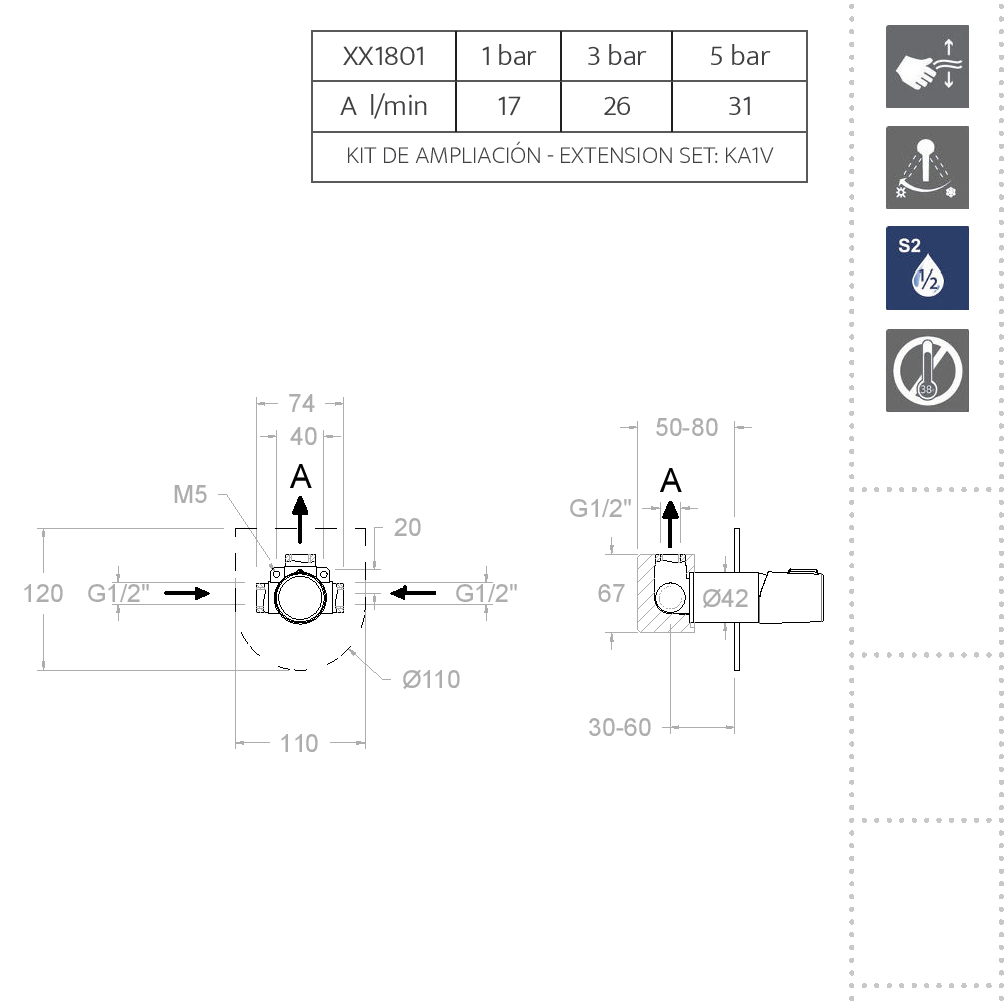 - S2 система экономии воды, открывая ручку смесителя в два этапа.