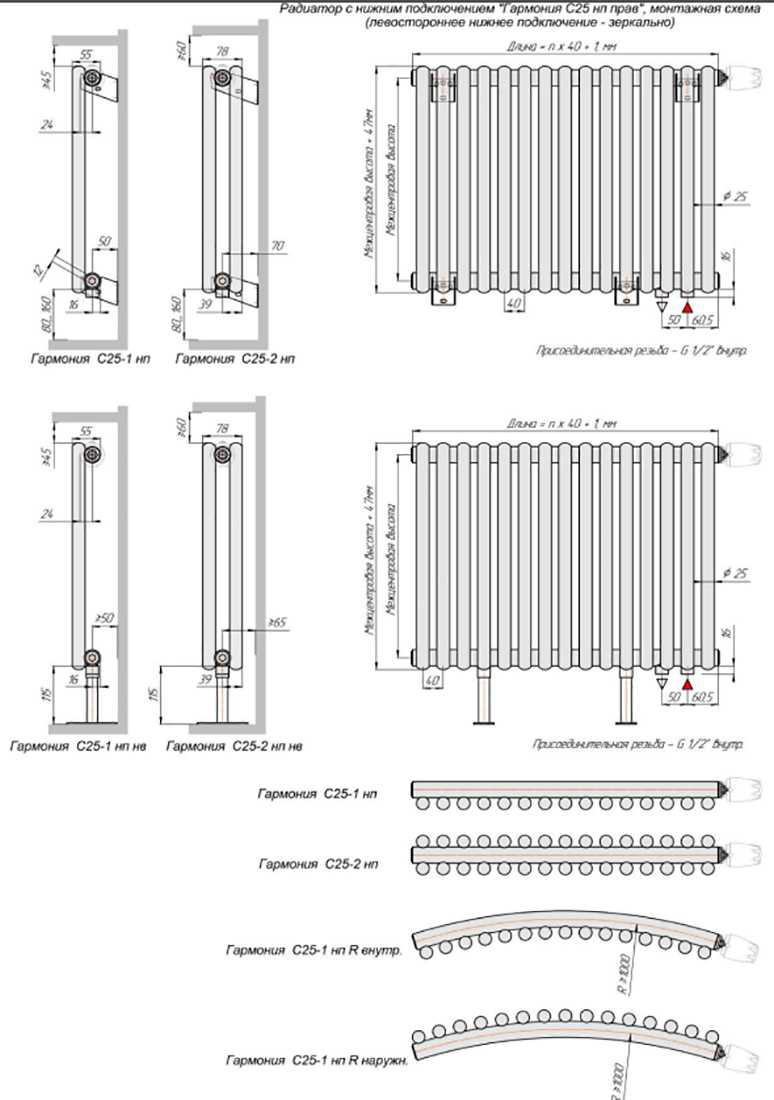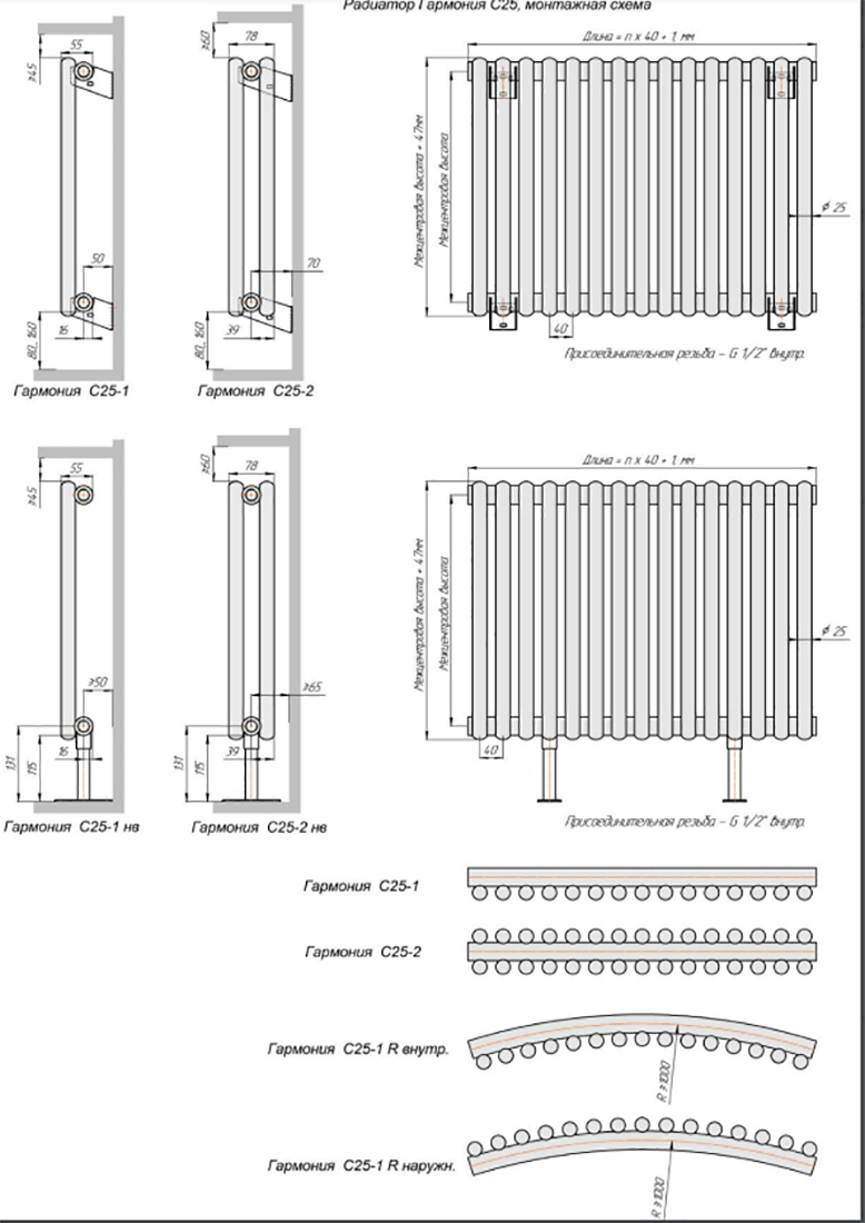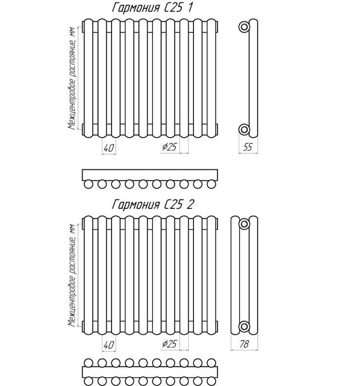 Радиатор серии Гармония С – это модифицированная версия классической Гармонии. Секция радиатора чуть меньше и представляет собой трубку, запаянную с двух сторон. Ключевое отличие модели Гармония С заключается в дизайне: трубчатые колонки выполнены с торцами полусферической формы. Существуют две вариации данных моделей: Гармония С40 и Гармония С25 N, с диаметром трубки 40 и 25 мм соответственно. Так же, как и классическая модель, Гармония С40 и Гармония С25 N может быть выполнена с одним и двумя рядами вертикальных трубок по глубине прибора.