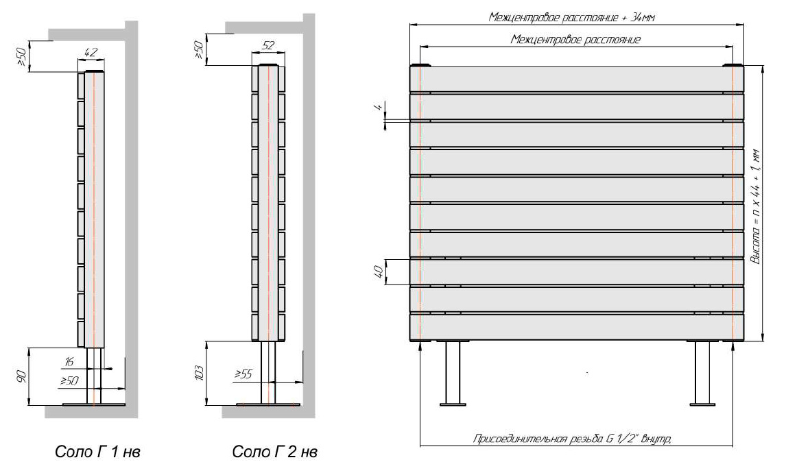 Существенным отличием данной модели является увеличенная более чем на 40% толщина стенки радиатора. Как результат, более высокое рабочее давление позволяет не только увеличить безопасность и долговечность прибора, но и устанавливать его в любые жилые помещения без каких-либо ограничений. Конструкция представляет собой прямоугольные трубы 40х10 мм, приваренные к коллекторам широкой стороной. Внешне радиаторы Соло напоминают панельные радиаторы, однако имеют более эстетичный и современный внешний вид без потери эффективности.