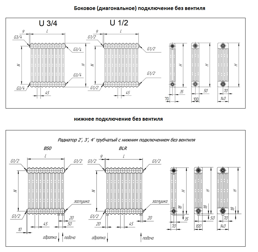 Подключение: боковое 1/2 или 3/4, нижнее одностороннее 50/ разностороннее, с термовентилем
