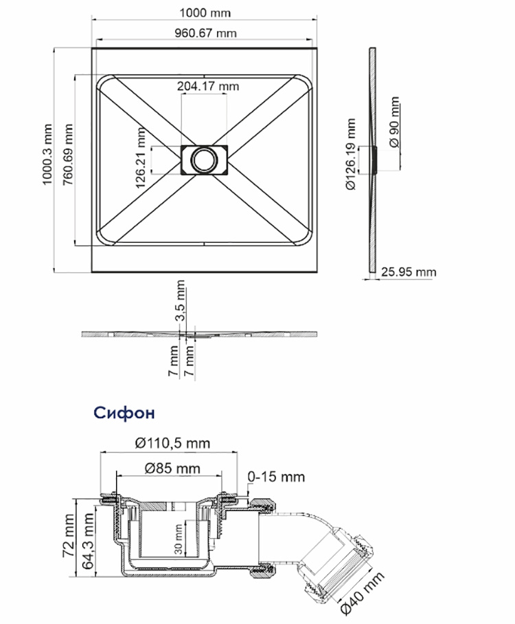 | Оснащение | Сифон, заглушка SMC (стеклопластик) |