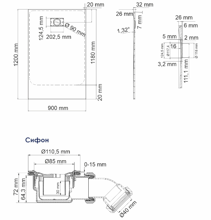 | Оснащение | Сифон, заглушка SMC (стеклопластик) |