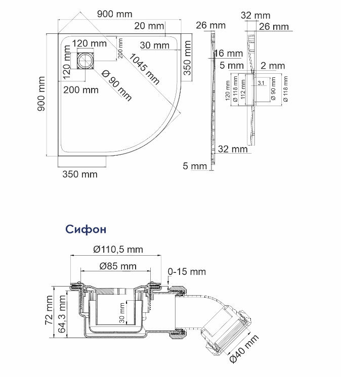 | Оснащение | Сифон, заглушка SMC (стеклопластик) |