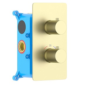 • встраиваемые термостаты на 2 или 3 (излив, ручной душ, верхняя лейка) выхода. Основная часть системы прячется внутрь стены, снаружи видны только переключатели температуры и рычаги регулировки напора. Лаконичные модели, позволяющие минимизировать уход за сантехникой и сэкономить место;