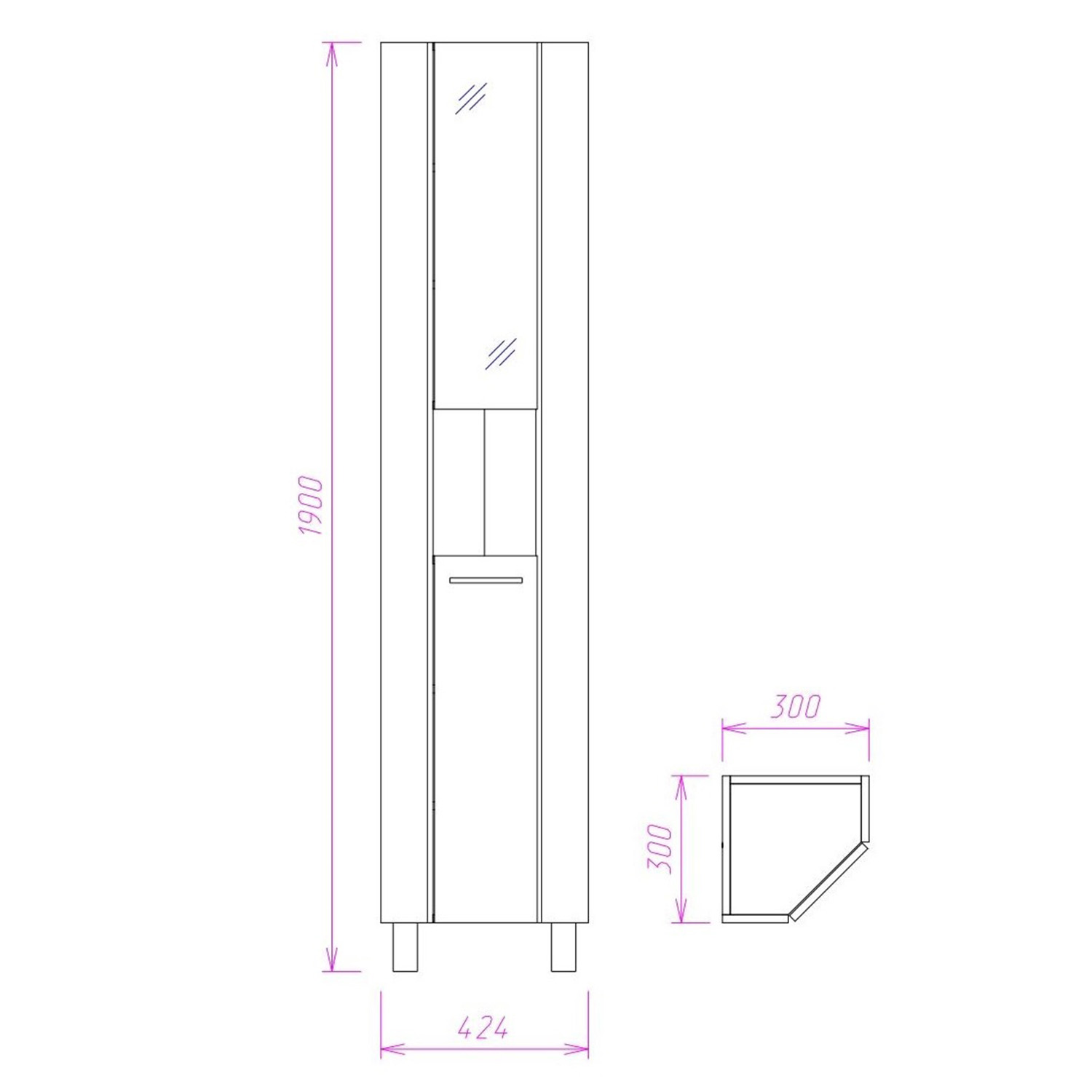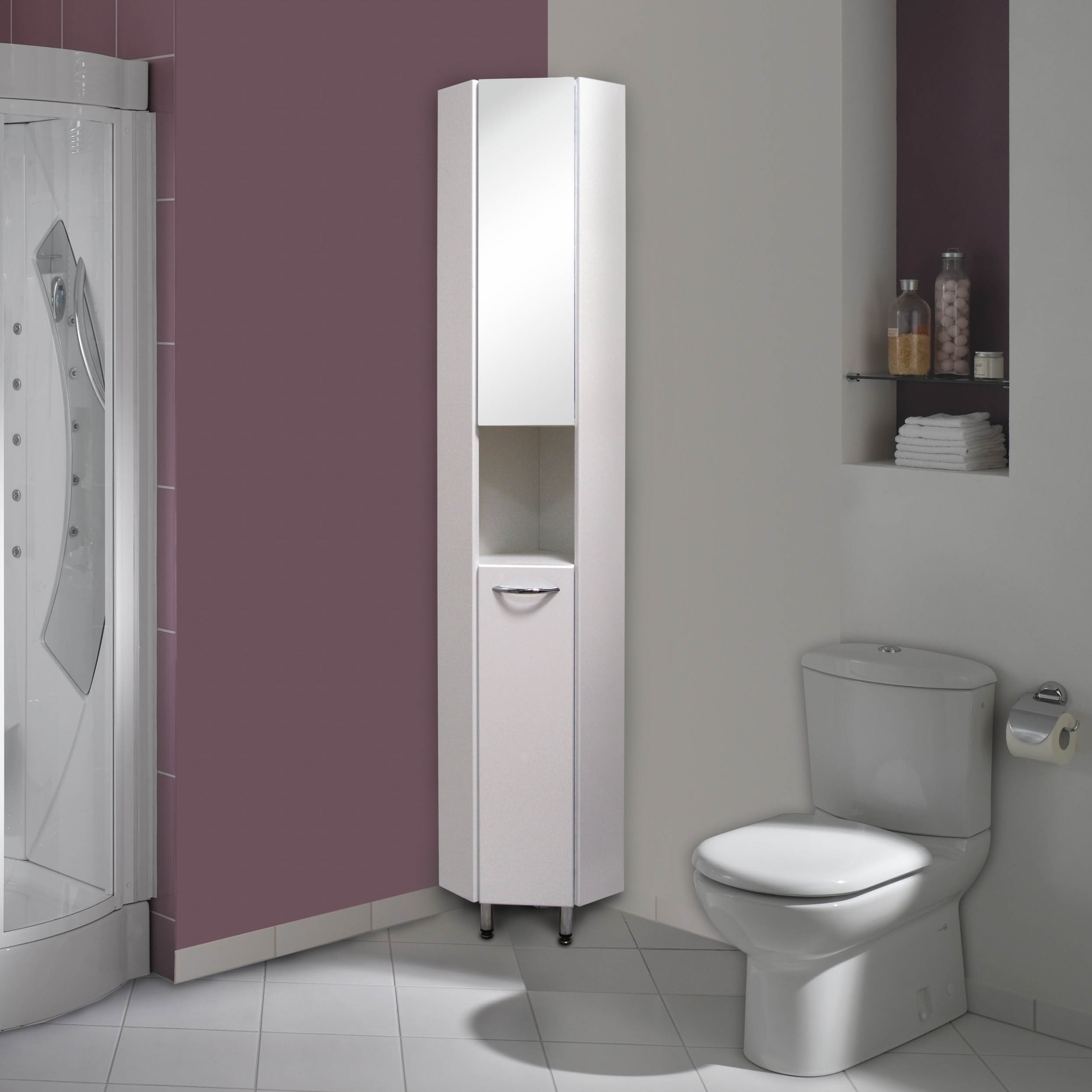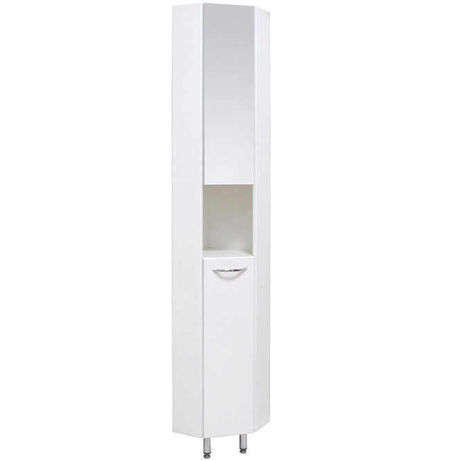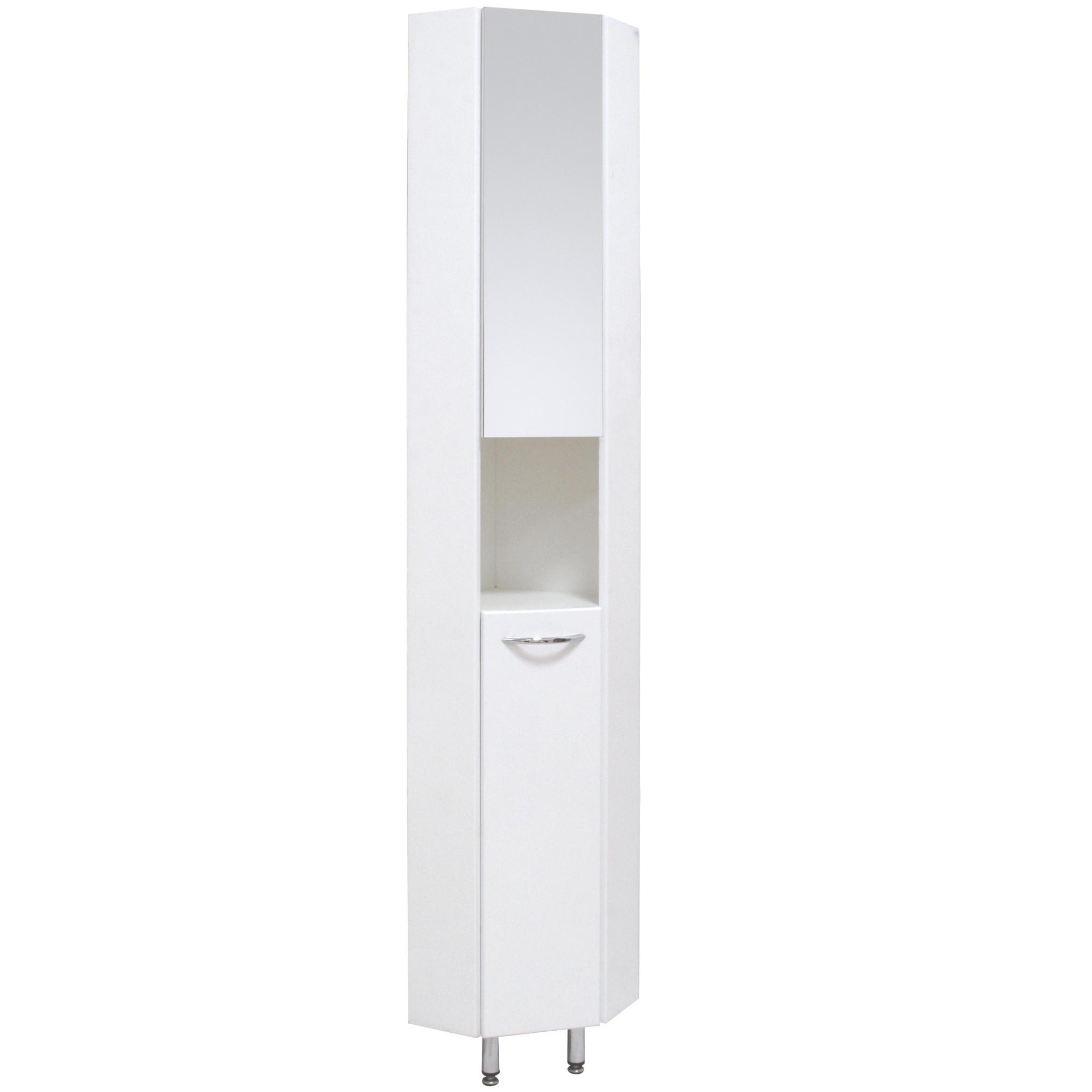 Напольный угловой шкаф пенал с зеркалом для ванной комнаты Onika ДЮНА 30 - настоящая находка для компактной ванной комнаты: он значительно экономит место без потери функциональности. Белая глянцевая поверхность, простая узкая ручка и минималистичный дизайн подойдет к любому интерьеру, а открытая полка посередине и два больших отделения за распашными дверями (верхняя дверь является зеркалом!) - отличное место для хранения необходимых вещей. Корпус пенала выполнен из ЛДСП, фасад - из МДФ в пленке, устойчивых к механическим воздействиям, перепадам температур и высокой влажности. 2 декоративных и 1 пластиковая ножки с регулировкой по высоте, а так же хромированная ручка идут в комплекте с пеналом.