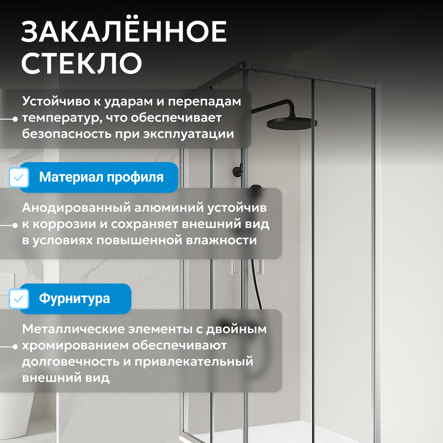 Профиль выполнен в хромированном цвете, что упрощает уход и гармонирует с современными интерьерами. Закалённое прозрачное стекло толщиной 5 мм обеспечивает безопасность и визуально увеличивает пространство. Гарантия производителя — 3 года.