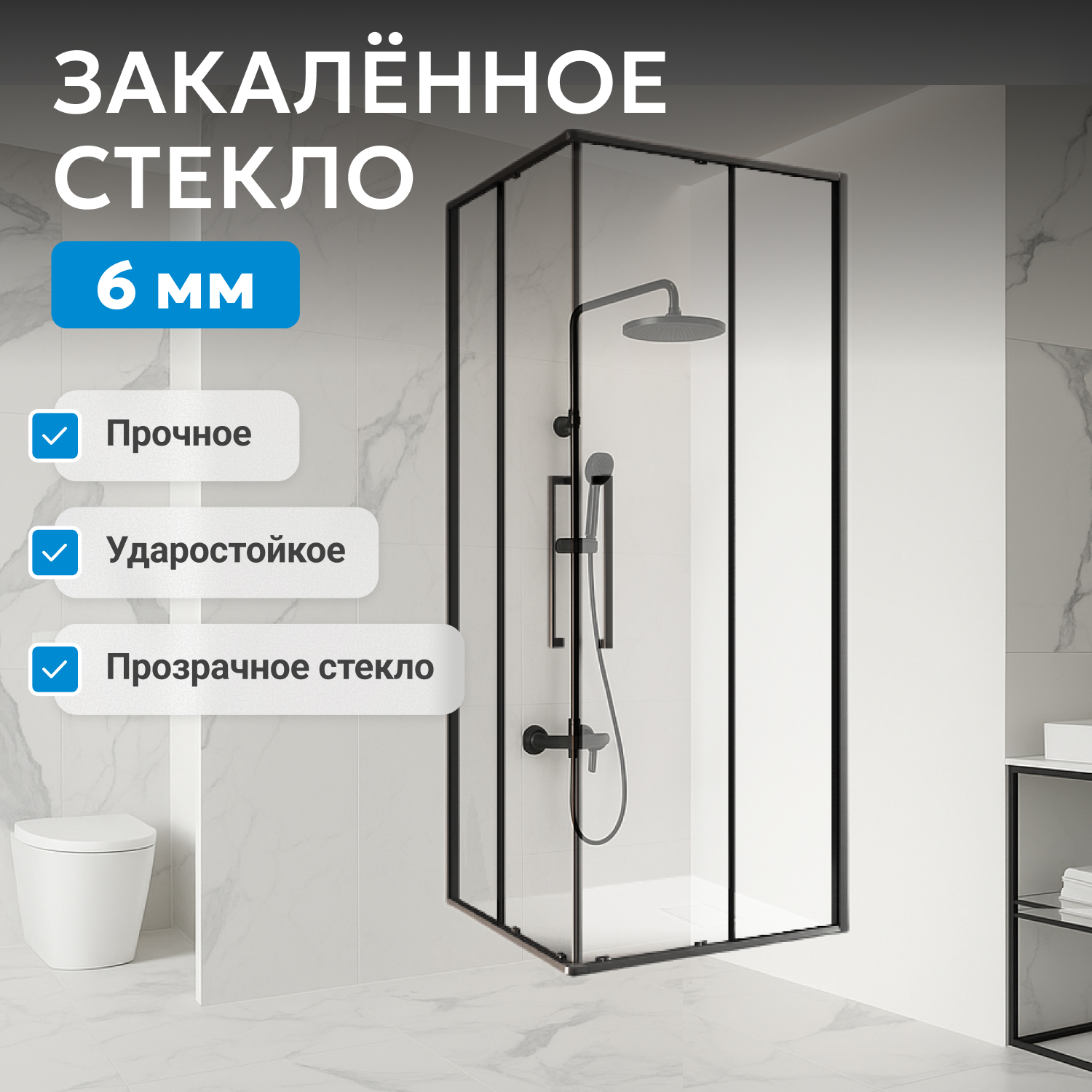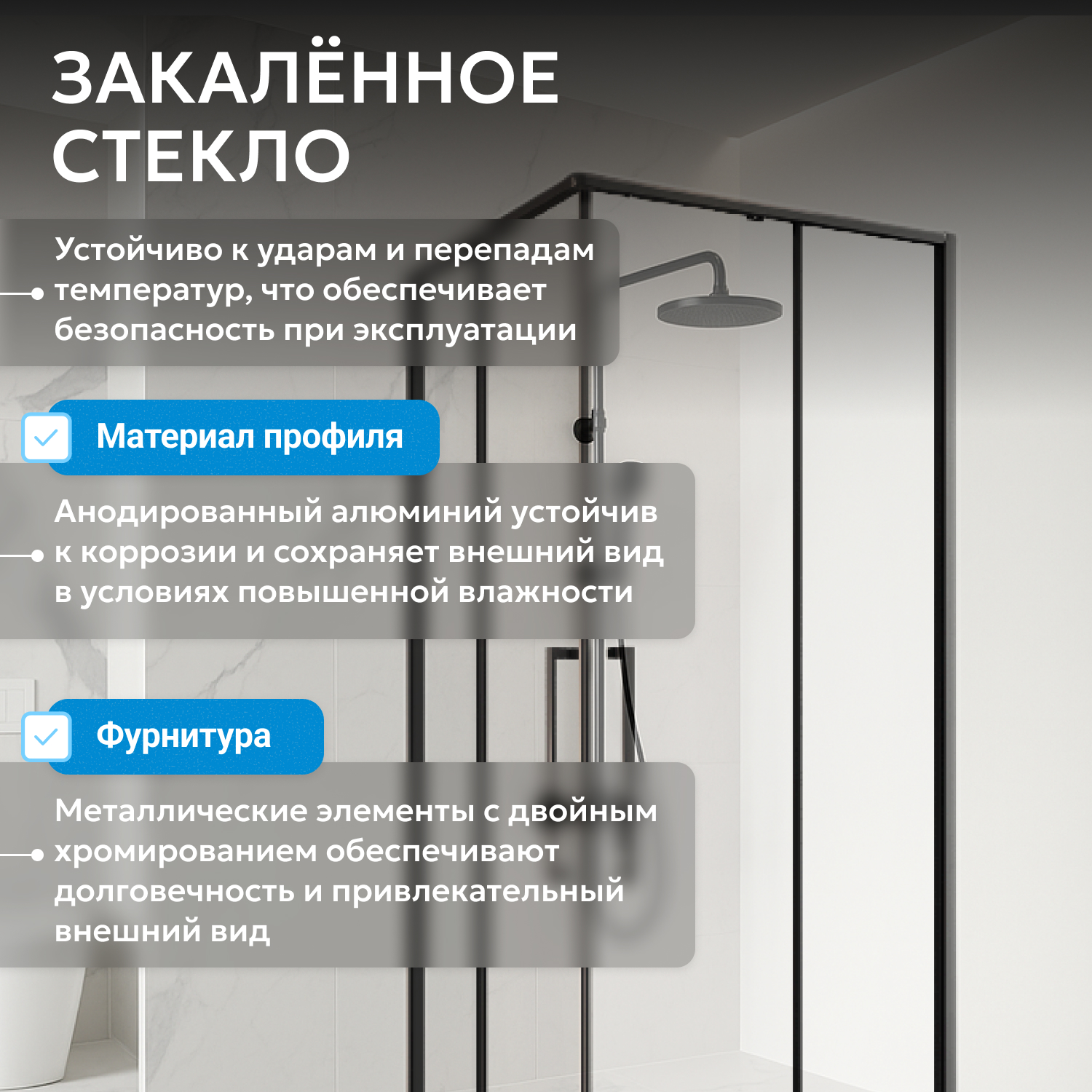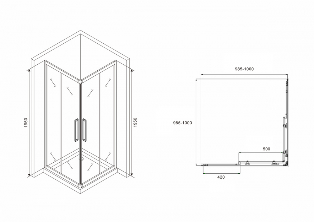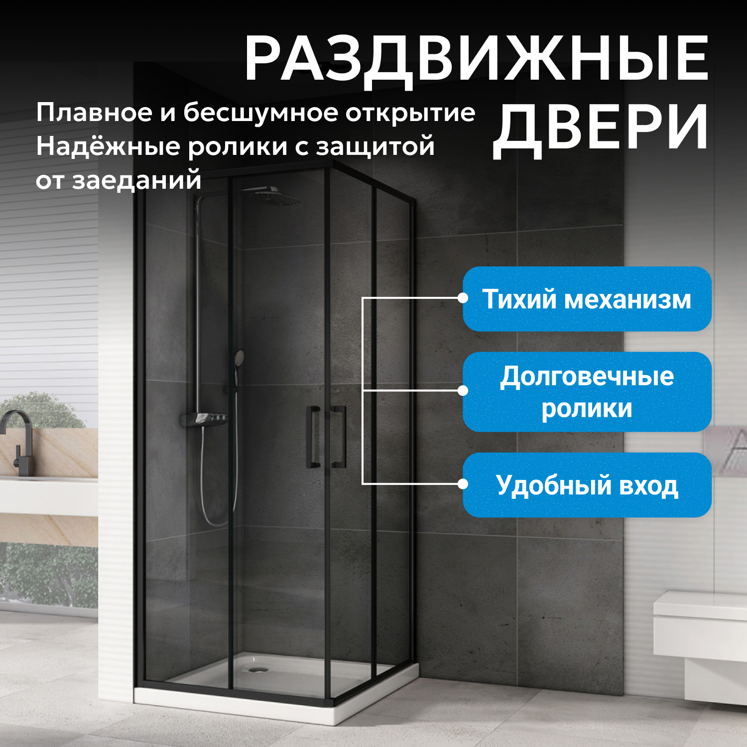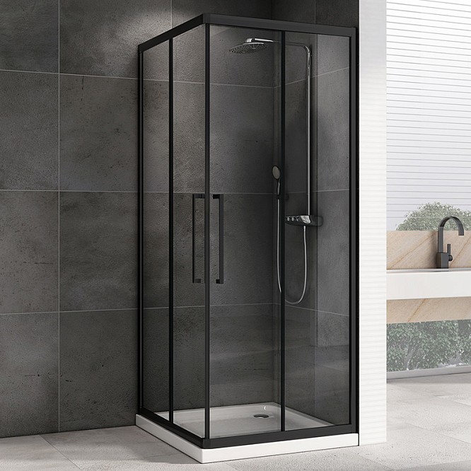 Модель оснащена двумя раздвижными дверями на двойных роликах для лёгкого и плавного открывания. Металлические увеличенные ручки обеспечивают удобство и гармонируют с универсальным стилем. Установка возможна как на пол, так и на соответствующий низкий поддон, что даёт выбор способа монтажа. Система роликов и плотное прилегание створок защищают от протечек даже без доводчиков и водоотталкивающего покрытия.